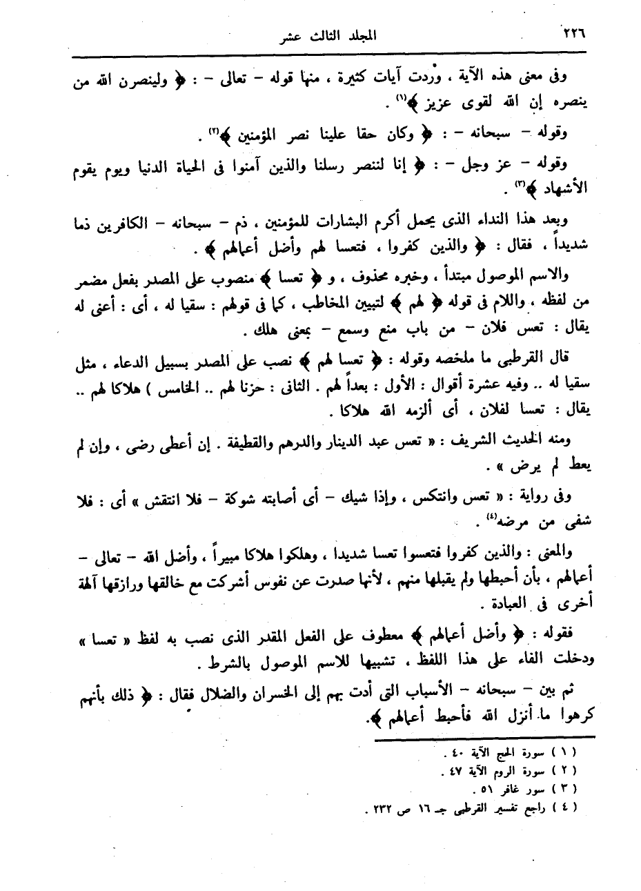 وبعد هذا النداء الذي يحمل أكرم البشارات للمؤمنين، ذم- سبحانه- الكافرين ذما شديدا، فقال: وَالَّذِينَ كَفَرُوا، فَتَعْساً لَهُمْ وَأَضَلَّ أَعْمالَهُمْ.