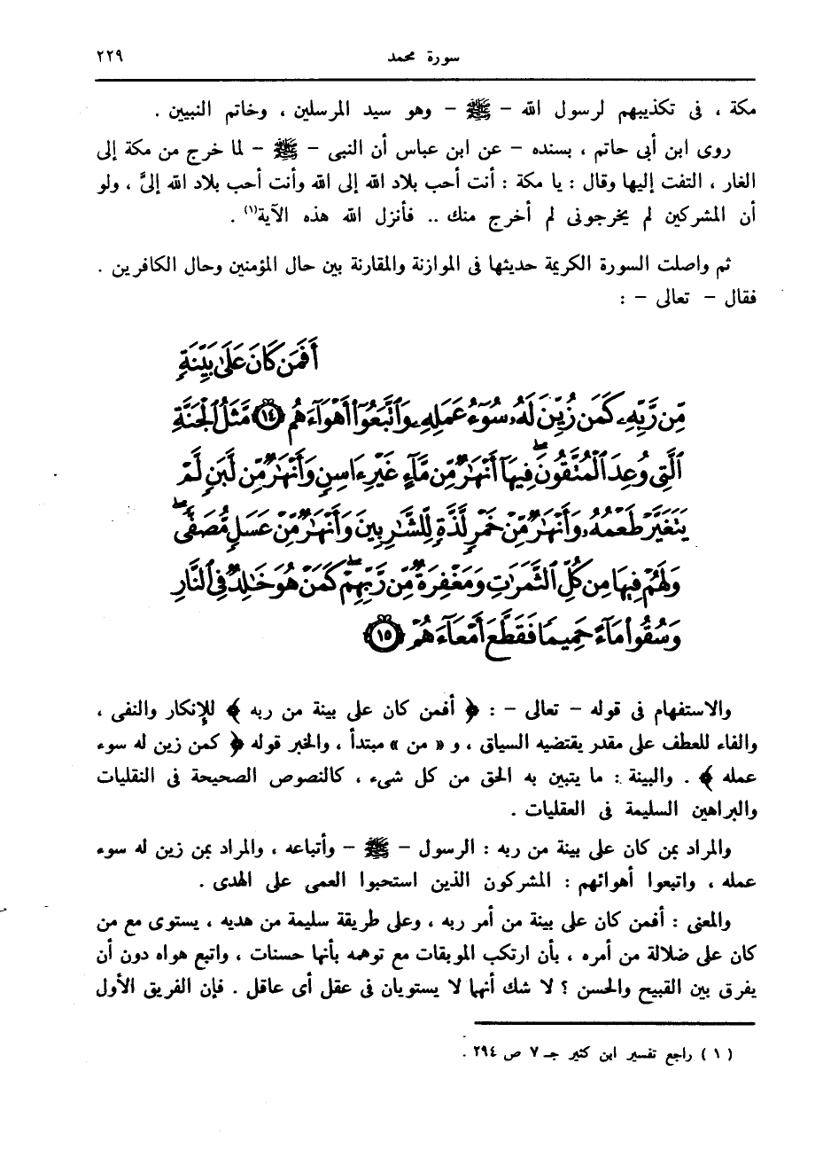 أَفَمَنْ كانَ عَلى بَيِّنَةٍ مِنْ رَبِّهِ كَمَنْ زُيِّنَ لَهُ سُوءُ عَمَلِهِ وَاتَّبَعُوا أَهْواءَهُمْ (14) مَثَلُ الْجَنَّةِ الَّتِي وُعِدَ الْمُتَّقُونَ فِيها أَنْهارٌ مِنْ ماءٍ غَيْرِ آسِنٍ وَأَنْهارٌ مِنْ لَبَنٍ لَمْ يَتَغَيَّرْ طَعْمُهُ وَأَنْهارٌ مِنْ خَمْرٍ لَذَّةٍ لِلشَّارِبِينَ وَأَنْهارٌ مِنْ عَسَلٍ مُصَفًّى وَلَهُمْ فِيها مِنْ كُلِّ الثَّمَراتِ وَمَغْفِرَةٌ مِنْ رَبِّهِمْ كَمَنْ هُوَ خالِدٌ فِي النَّارِ وَسُقُوا ماءً حَمِيماً فَقَطَّعَ أَمْعاءَهُمْ (15)