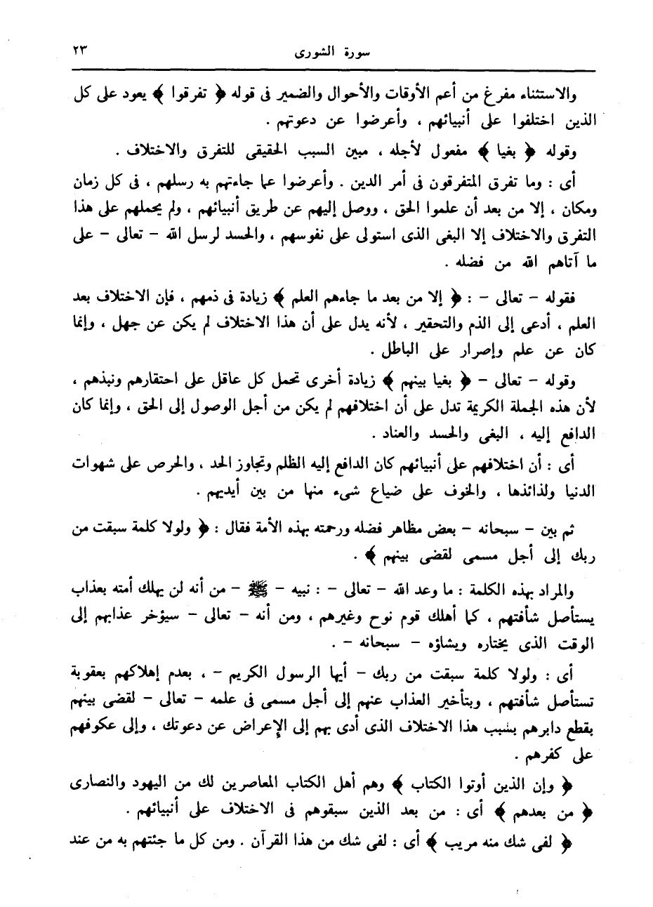 ثم بين- سبحانه- بعض مظاهر فضله ورحمته بهذه الأمة فقال: وَلَوْلا كَلِمَةٌ سَبَقَتْ مِنْ رَبِّكَ إِلى أَجَلٍ مُسَمًّى لَقُضِيَ بَيْنَهُمْ.