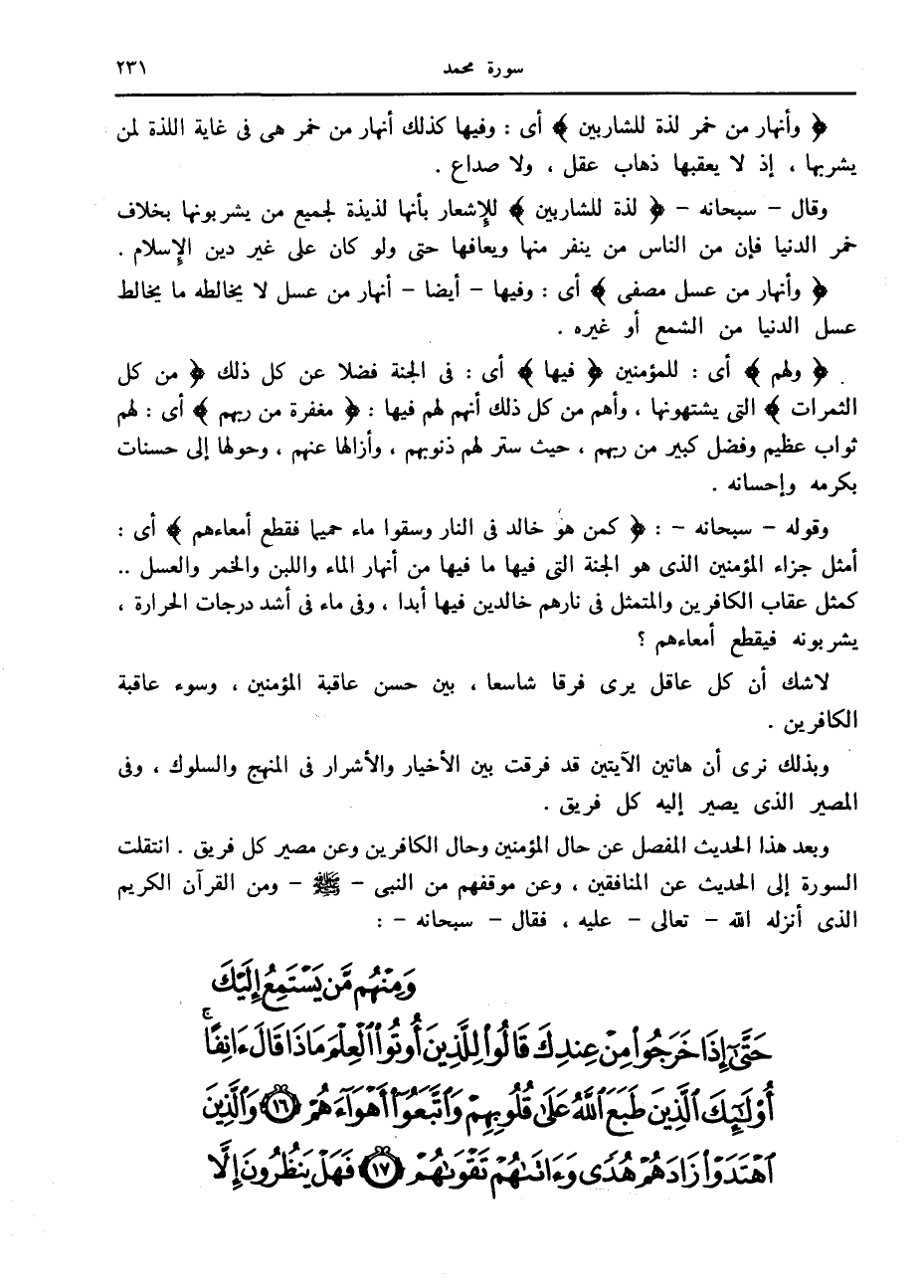 وبعد هذا الحديث المفصل عن حال المؤمنين وحال الكافرين وعن مصير كل فريق. انتقلت السورة إلى الحديث عن المنافقين، وعن موقفهم من النبي صلّى الله عليه وسلّم ومن القرآن الكريم الذي أنزله الله- تعالى- عليه، فقال- سبحانه-: