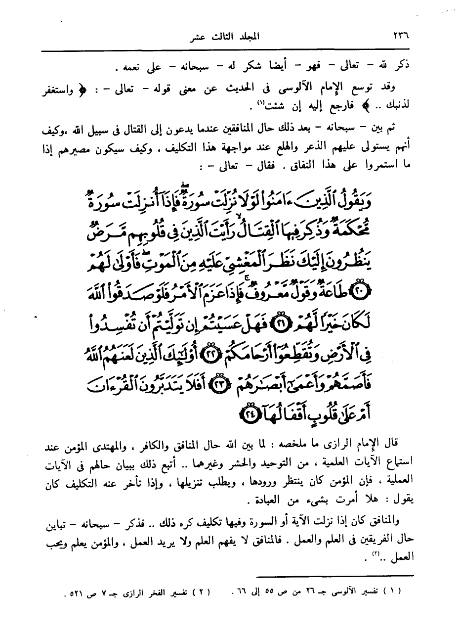 والمنافق كان إذا نزلت الآية أو السورة وفيها تكليف كره ذلك.. فذكر- سبحانه- تباين حال الفريقين في العلم والعمل. فالمنافق لا يفهم العلم ولا يريد العمل، والمؤمن يعلم ويحب العمل.. «2» .