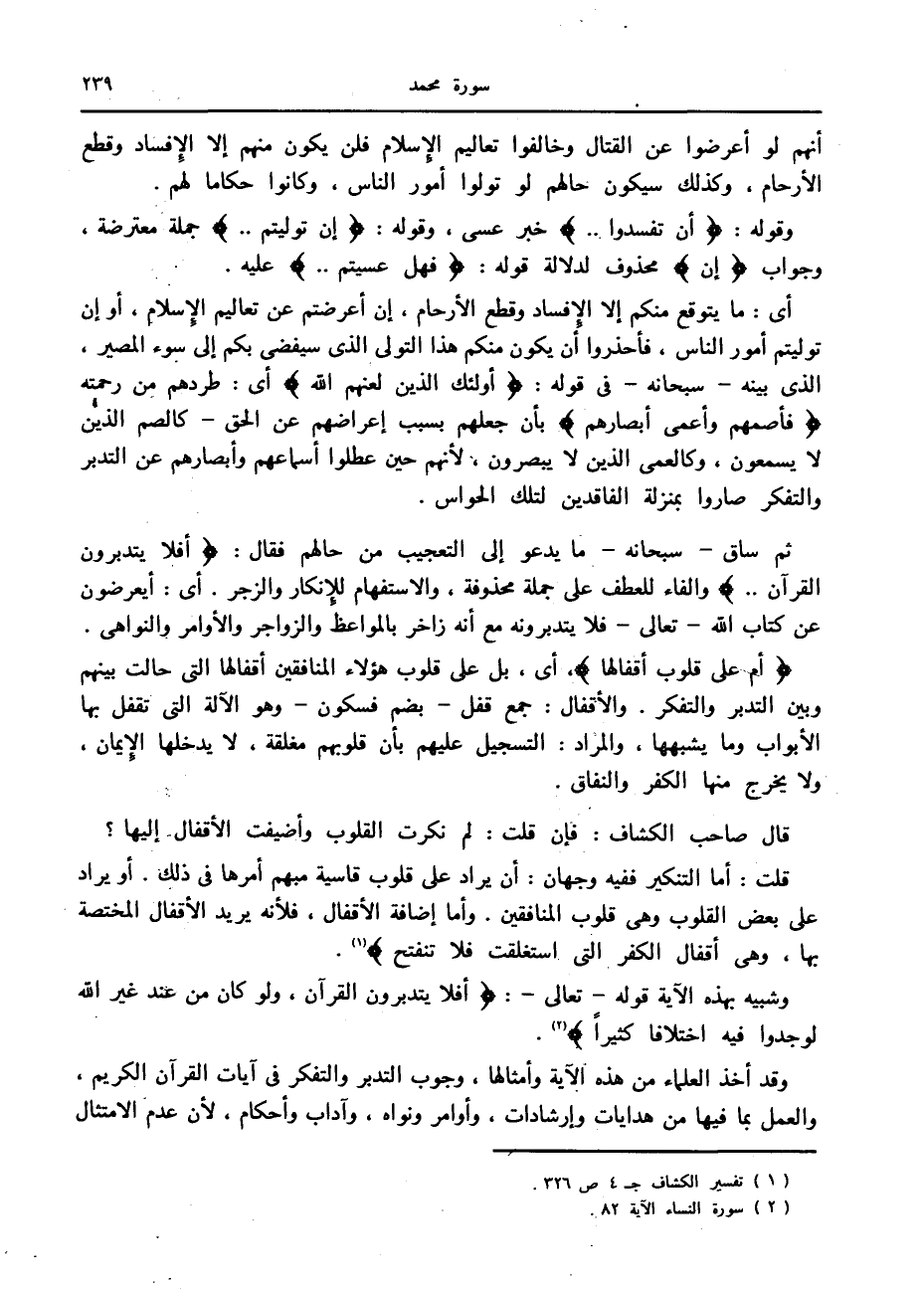 أى: ما يتوقع منكم إلا الإفساد وقطع الأرحام، إن أعرضتم عن تعاليم الإسلام، أو إن توليتم أمور الناس، فاحذروا أن يكون منكم هذا التولي الذي سيفضى بكم إلى سوء المصير، الذي بينه- سبحانه- في قوله: أُولئِكَ الَّذِينَ لَعَنَهُمُ اللَّهُ أى: طردهم من رحمته فَأَصَمَّهُمْ وَأَعْمى أَبْصارَهُمْ بأن جعلهم بسبب إعراضهم عن الحق- كالصم الذين لا يسمعون، وكالعمى الذين لا يبصرون، لأنهم حين عطلوا أسماعهم وأبصارهم عن التدبر والتفكر صاروا بمنزلة الفاقدين لتلك الحواس.