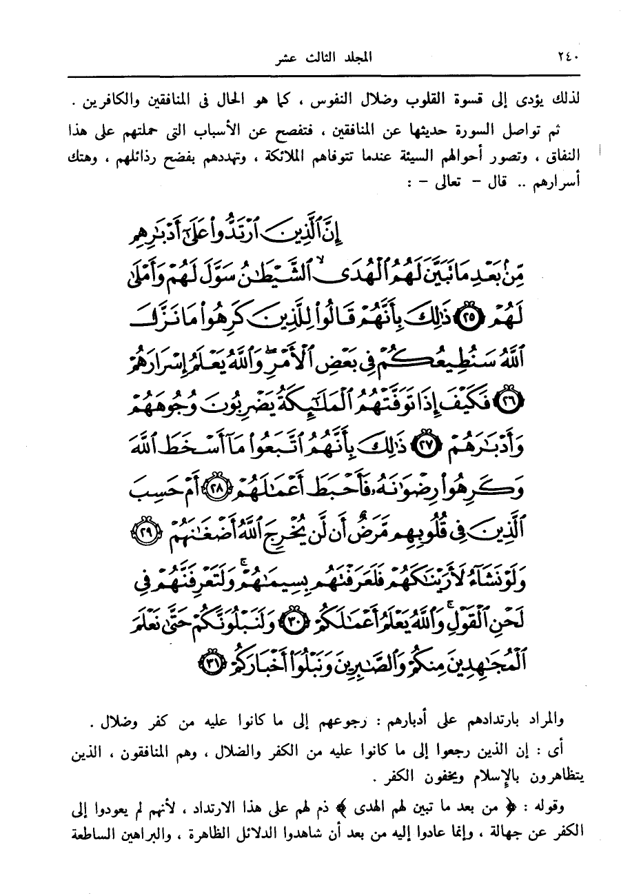 إِنَّ الَّذِينَ ارْتَدُّوا عَلى أَدْبارِهِمْ مِنْ بَعْدِ ما تَبَيَّنَ لَهُمُ الْهُدَى الشَّيْطانُ سَوَّلَ لَهُمْ وَأَمْلى لَهُمْ (25) ذلِكَ بِأَنَّهُمْ قالُوا لِلَّذِينَ كَرِهُوا ما نَزَّلَ اللَّهُ سَنُطِيعُكُمْ فِي بَعْضِ الْأَمْرِ وَاللَّهُ يَعْلَمُ إِسْرارَهُمْ (26) فَكَيْفَ إِذا تَوَفَّتْهُمُ الْمَلائِكَةُ يَضْرِبُونَ وُجُوهَهُمْ وَأَدْبارَهُمْ (27) ذلِكَ بِأَنَّهُمُ اتَّبَعُوا ما أَسْخَطَ اللَّهَ وَكَرِهُوا رِضْوانَهُ فَأَحْبَطَ أَعْمالَهُمْ (28) أَمْ حَسِبَ الَّذِينَ فِي قُلُوبِهِمْ مَرَضٌ أَنْ لَنْ يُخْرِجَ اللَّهُ أَضْغانَهُمْ (29)
