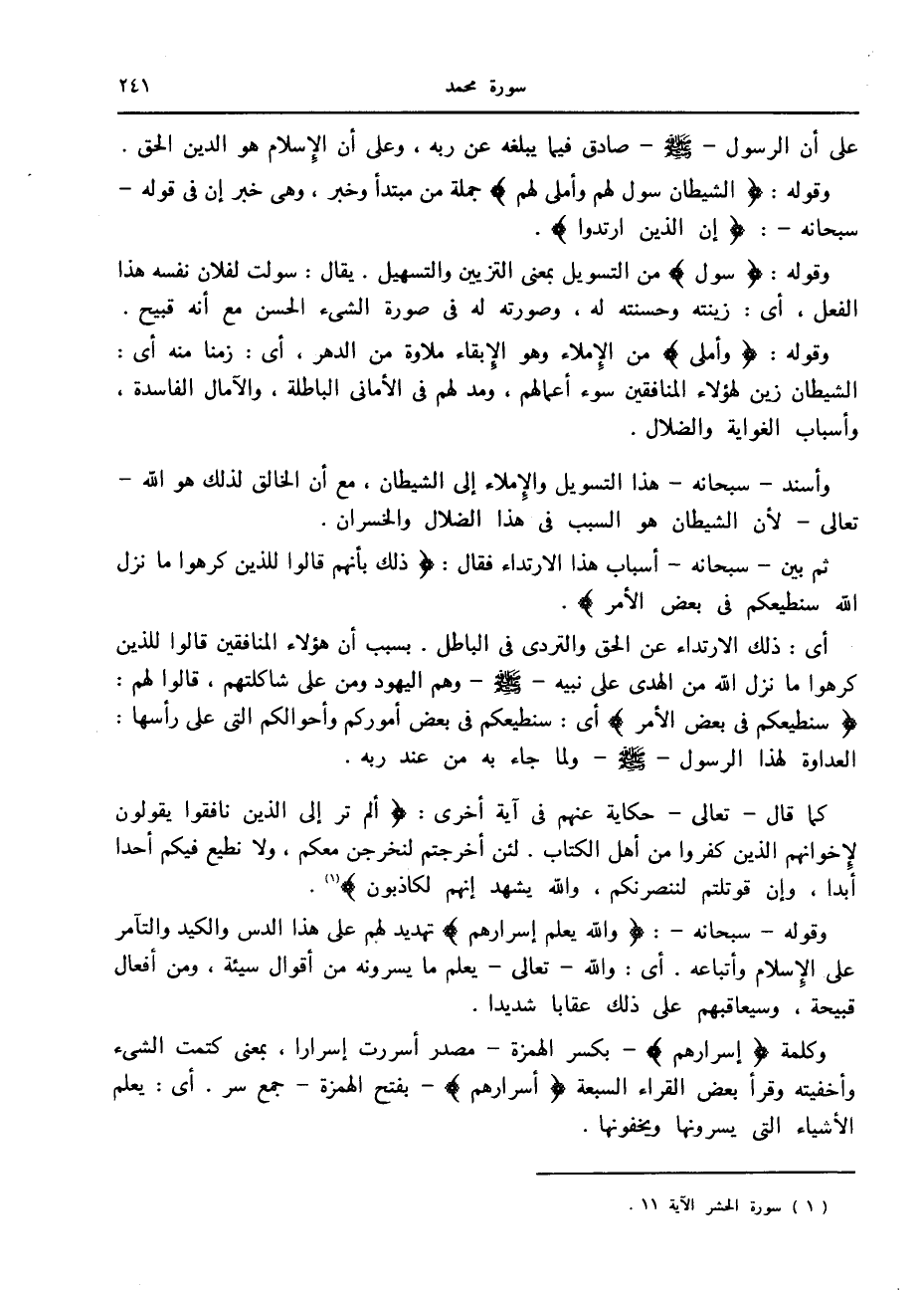 وقوله: الشَّيْطانُ سَوَّلَ لَهُمْ وَأَمْلى لَهُمْ جملة من مبتدأ وخبر، وهي خبر إن في قوله- سبحانه-: إِنَّ الَّذِينَ ارْتَدُّوا.