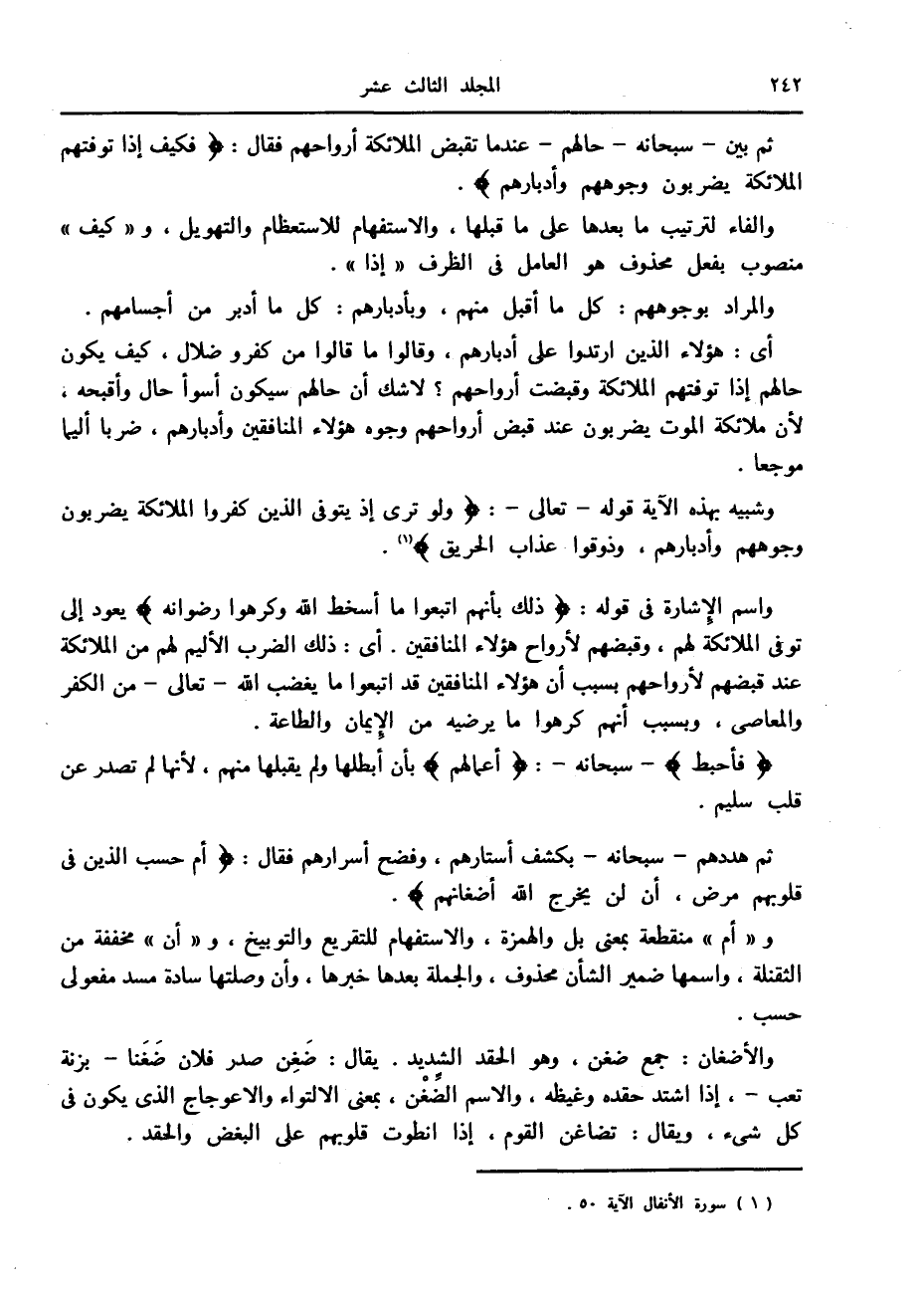 ثم بين- سبحانه- حالهم- عند ما تقبض الملائكة أرواحهم فقال: فَكَيْفَ إِذا تَوَفَّتْهُمُ الْمَلائِكَةُ يَضْرِبُونَ وُجُوهَهُمْ وَأَدْبارَهُمْ.
