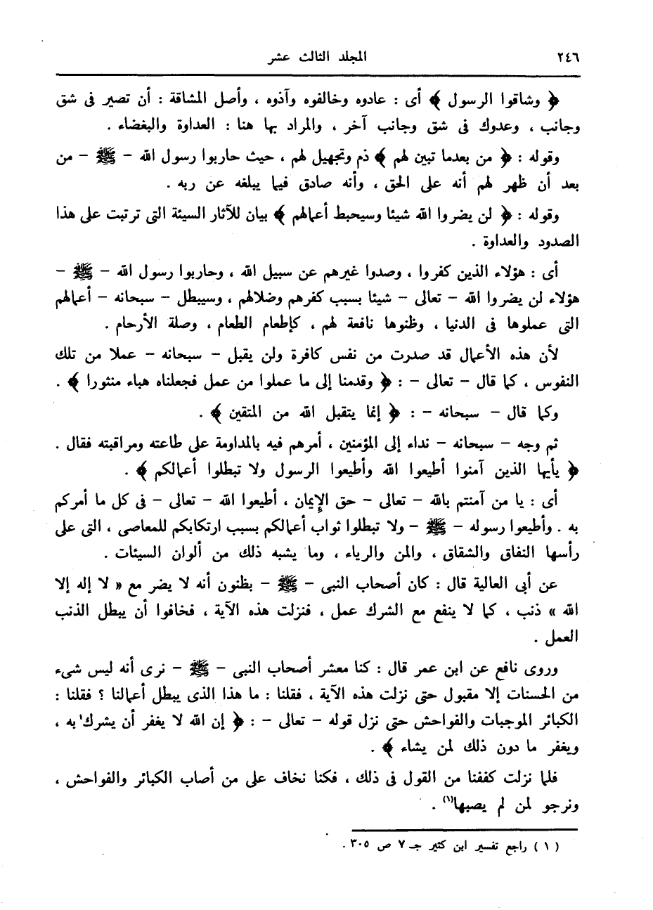 الكبائر الموجبات والفواحش حتى نزل قوله- تعالى-: إِنَّ اللَّهَ لا يَغْفِرُ أَنْ يُشْرَكَ بِهِ، وَيَغْفِرُ ما دُونَ ذلِكَ لِمَنْ يَشاءُ.