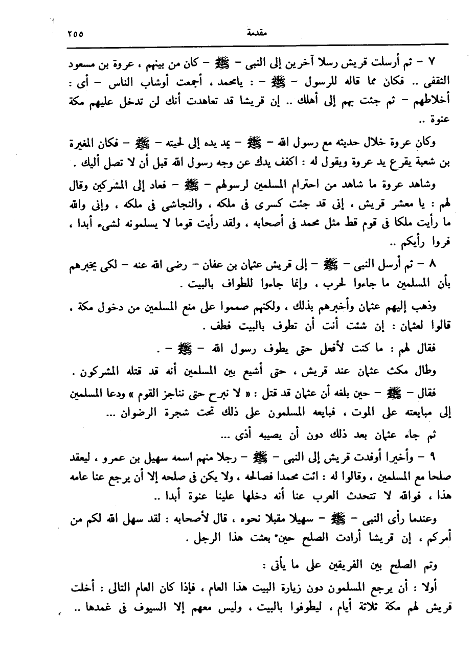 8- ثم أرسل النبي صلّى الله عليه وسلّم إلى قريش عثمان بن عفان- رضى الله عنه- لكي يخبرهم بأن المسلمين ما جاءوا لحرب، وإنما جاءوا للطواف بالبيت.