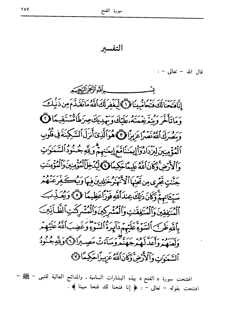 إِنَّا فَتَحْنا لَكَ فَتْحاً مُبِيناً (1) لِيَغْفِرَ لَكَ اللَّهُ ما تَقَدَّمَ مِنْ ذَنْبِكَ وَما تَأَخَّرَ وَيُتِمَّ نِعْمَتَهُ عَلَيْكَ وَيَهْدِيَكَ صِراطاً مُسْتَقِيماً (2) وَيَنْصُرَكَ اللَّهُ نَصْراً عَزِيزاً (3) هُوَ الَّذِي أَنْزَلَ السَّكِينَةَ فِي قُلُوبِ الْمُؤْمِنِينَ لِيَزْدادُوا إِيماناً مَعَ إِيمانِهِمْ وَلِلَّهِ جُنُودُ السَّماواتِ وَالْأَرْضِ وَكانَ اللَّهُ عَلِيماً حَكِيماً (4)