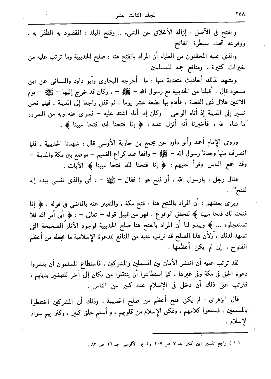 ويرى بعضهم: أن المراد بالفتح هنا: فتح مكة، والتعبير عنه بالماضي في قوله: إِنَّا فَتَحْنا لَكَ فَتْحاً مُبِيناً لتحقق الوقوع، فهو من قبيل قوله- تعالى-: أَتى أَمْرُ اللَّهِ فَلا تَسْتَعْجِلُوهُ ... ويبدو لنا أن المراد بالفتح هنا صلح الحديبية لوجود الآثار الصحيحة التي تشهد لذلك، ولأن هذا الصلح قد ترتب عليه من المنافع للدعوة الإسلامية ما يجعله من أعظم الفتوح، إن لم يكن أعظمها.
