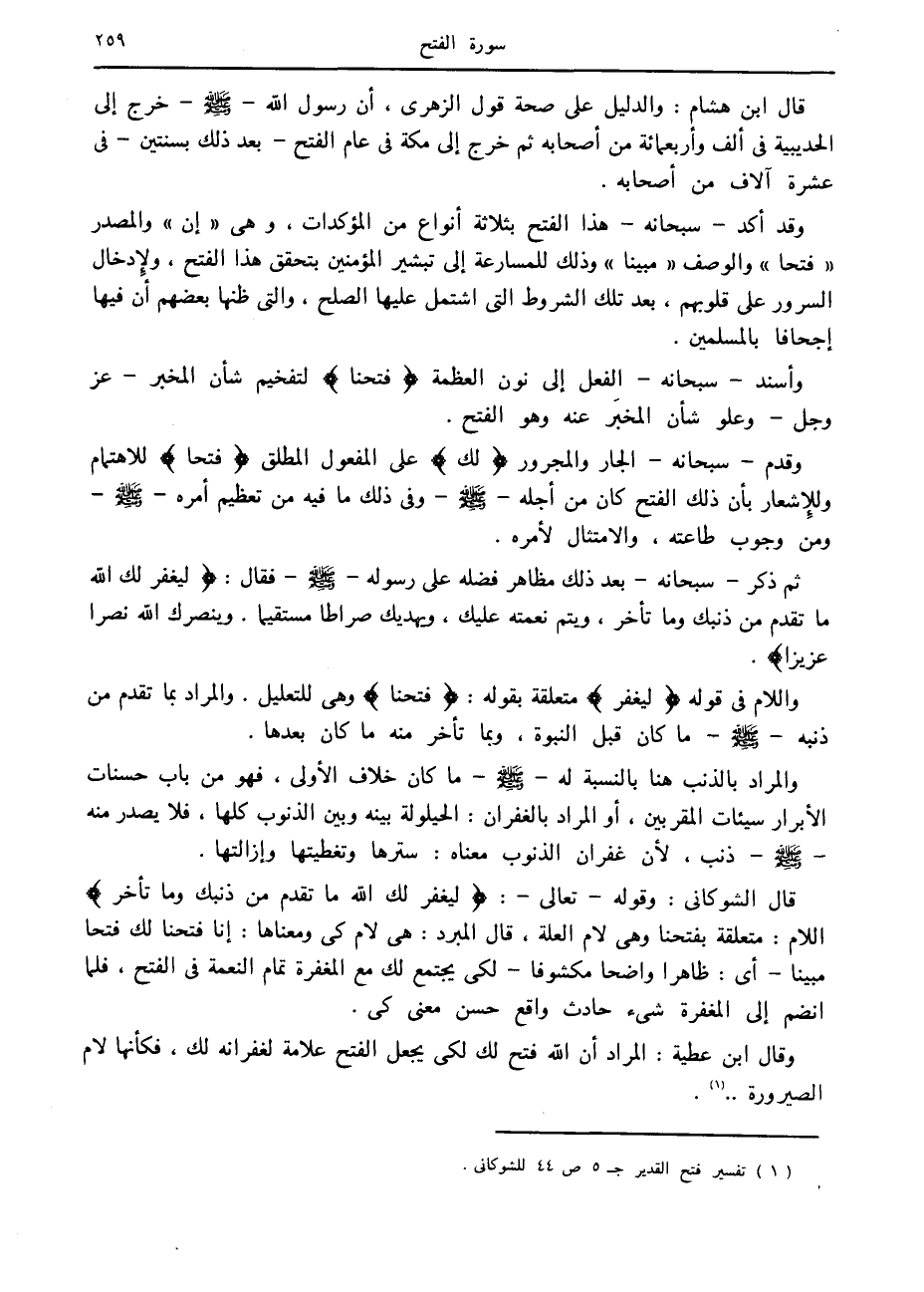 قال الشوكانى: وقوله- تعالى-: لِيَغْفِرَ لَكَ اللَّهُ ما تَقَدَّمَ مِنْ ذَنْبِكَ وَما تَأَخَّرَ اللام: متعلقة بفتحنا وهي لام العلة، قال المبرد: هي لام كي ومعناها: إنا فتحنا لك فتحا مبينا- أى: ظاهرا واضحا مكشوفا- لكي يجتمع لك مع المغفرة تمام النعمة في الفتح، فلما انضم إلى المغفرة شيء حادث واقع حسن معنى كي.