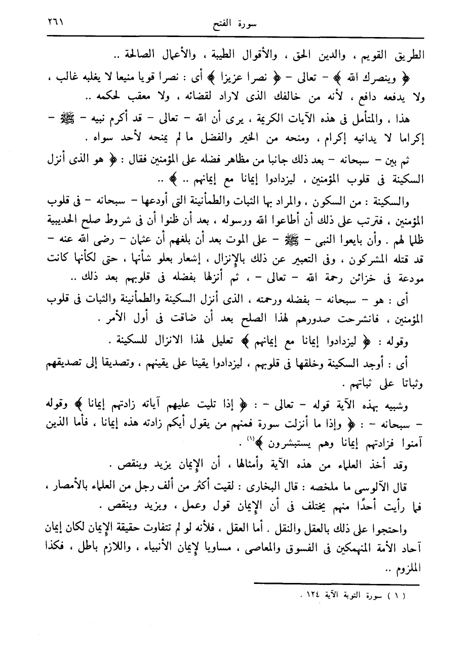 قال الآلوسى ما ملخصه: قال البخاري: لقيت أكثر من ألف رجل من العلماء بالأمصار، فما رأيت أحدا منهم يختلف في أن الإيمان قول وعمل، ويزيد وينقص.