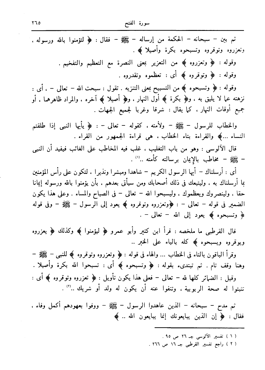 وقرأ الباقون بالتاء في الخطاب ... والهاء في قوله: وَتُعَزِّرُوهُ وَتُوَقِّرُوهُ للنبي صلّى الله عليه وسلّم وهنا وقف تام. ثم تبتدئ بقوله: وَتُسَبِّحُوهُ أى: تسبحوا الله بكرة وأصيلا.
