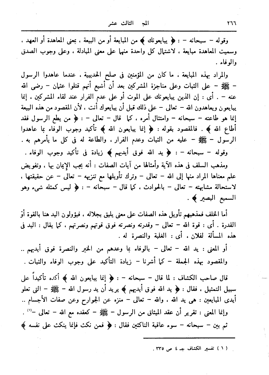 قال صاحب الكشاف: لما قال- سبحانه-: إِنَّما يُبايِعُونَ اللَّهَ أكده تأكيدا على سبيل التمثيل، فقال: يَدُ اللَّهِ فَوْقَ أَيْدِيهِمْ يريد أن يد رسول الله صلّى الله عليه وسلّم التي تعلو أيدى المبايعين: هي يد الله، والله- تعالى- منزه عن الجوارح وعن صفات الأجسام..