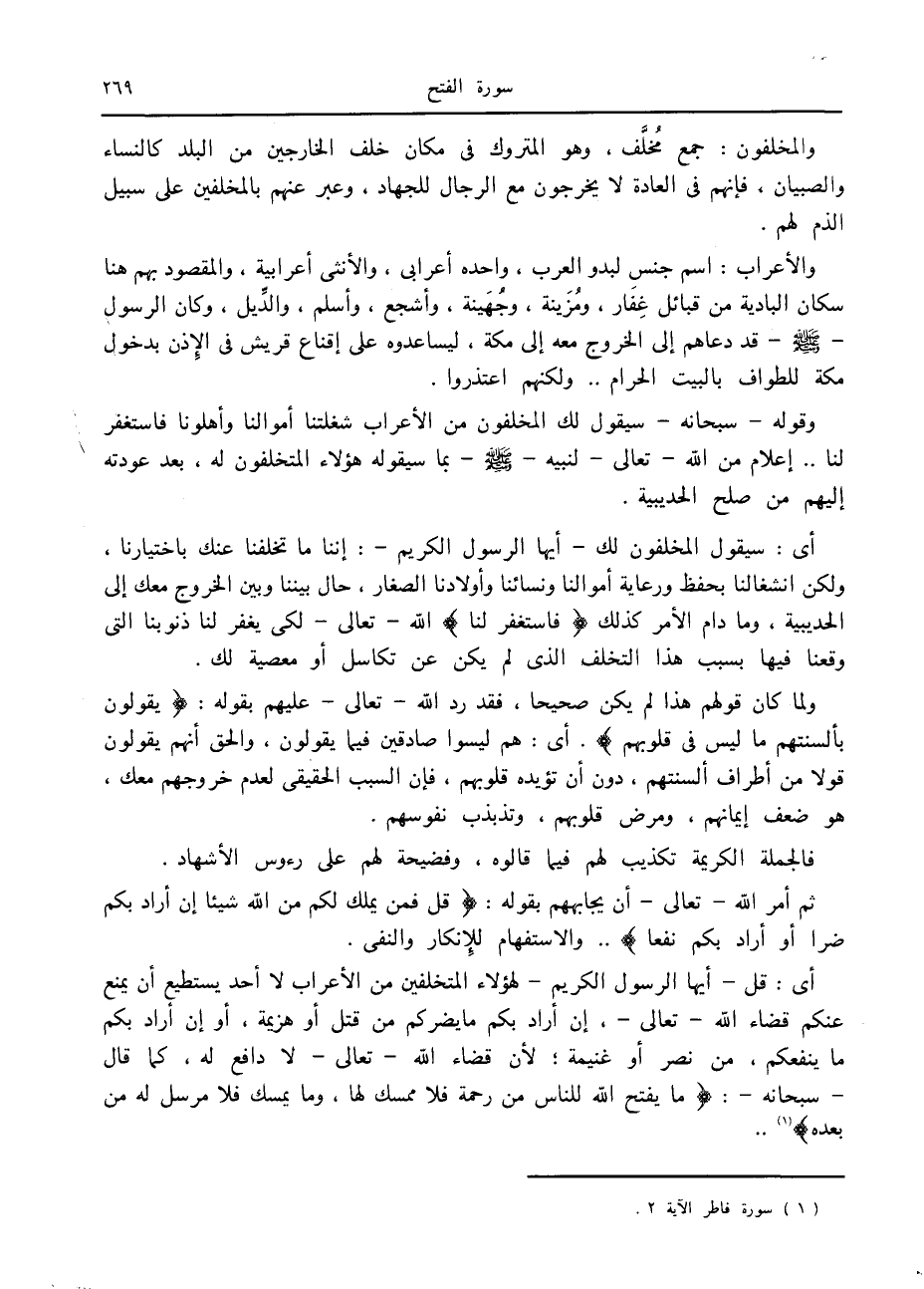 والأعراب: اسم جنس لبدو العرب، واحده أعرابى، والأنثى أعرابية، والمقصود بهم هنا سكان البادية من قبائل غفار، ومزينة، وجهينة، وأشجع، وأسلم، والدّيل، وكان الرسول صلّى الله عليه وسلّم قد دعاهم إلى الخروج معه إلى مكة، ليساعدوه على إقناع قريش في الإذن بدخول مكة للطواف بالبيت الحرام.. ولكنهم اعتذروا.