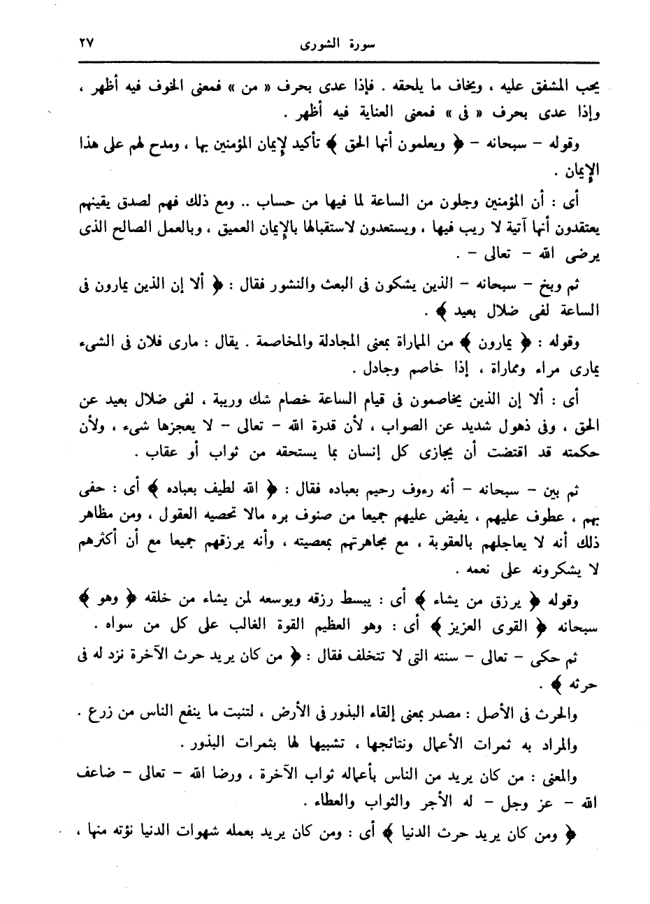 ثم حكى- تعالى- سنته التي لا تتخلف فقال: مَنْ كانَ يُرِيدُ حَرْثَ الْآخِرَةِ نَزِدْ لَهُ فِي حَرْثِهِ.