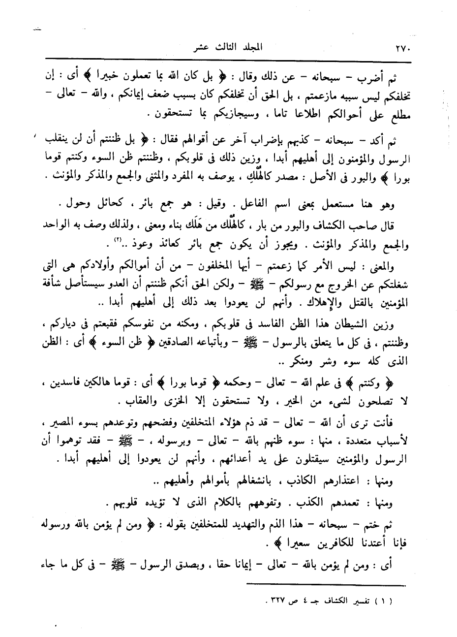 ثم أكد- سبحانه- كذبهم بإضراب آخر عن أقوالهم فقال: بَلْ ظَنَنْتُمْ أَنْ لَنْ يَنْقَلِبَ الرَّسُولُ وَالْمُؤْمِنُونَ إِلى أَهْلِيهِمْ أَبَداً، وَزُيِّنَ ذلِكَ فِي قُلُوبِكُمْ، وَظَنَنْتُمْ ظَنَّ السَّوْءِ وَكُنْتُمْ قَوْماً بُوراً والبور في الأصل: مصدر كالهلك، يوصف به المفرد والمثنى والجمع والمذكر والمؤنث.