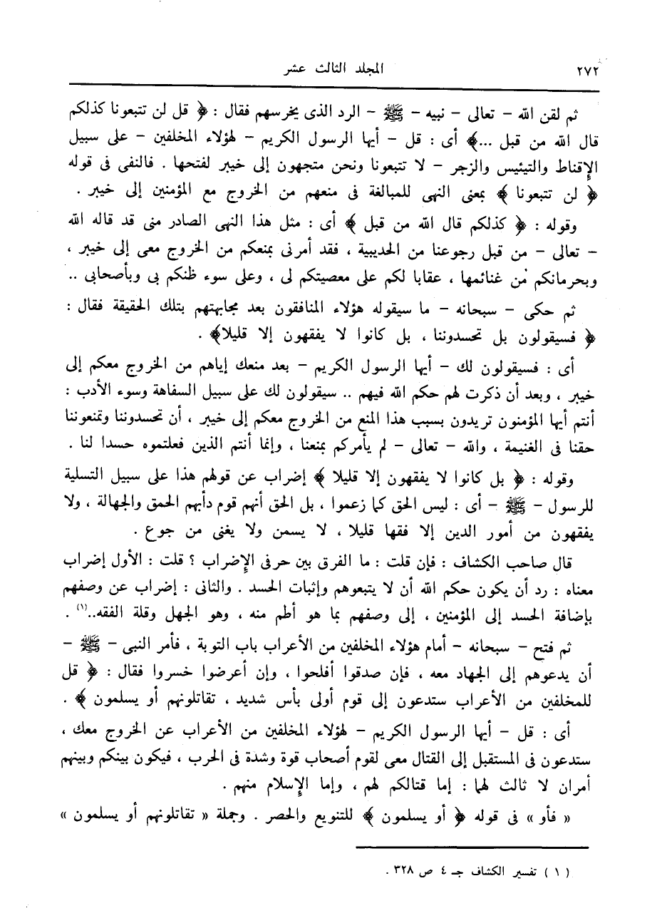 وقوله: كَذلِكُمْ قالَ اللَّهُ مِنْ قَبْلُ أى: مثل هذا النهى الصادر منى قد قاله الله- تعالى- من قبل رجوعنا من الحديبية، فقد أمرنى بمنعكم من الخروج معى إلى خيبر، وبحرمانكم من غنائمها، عقابا لكم على معصيتكم لي، وعلى سوء ظنكم بي وبأصحابى..