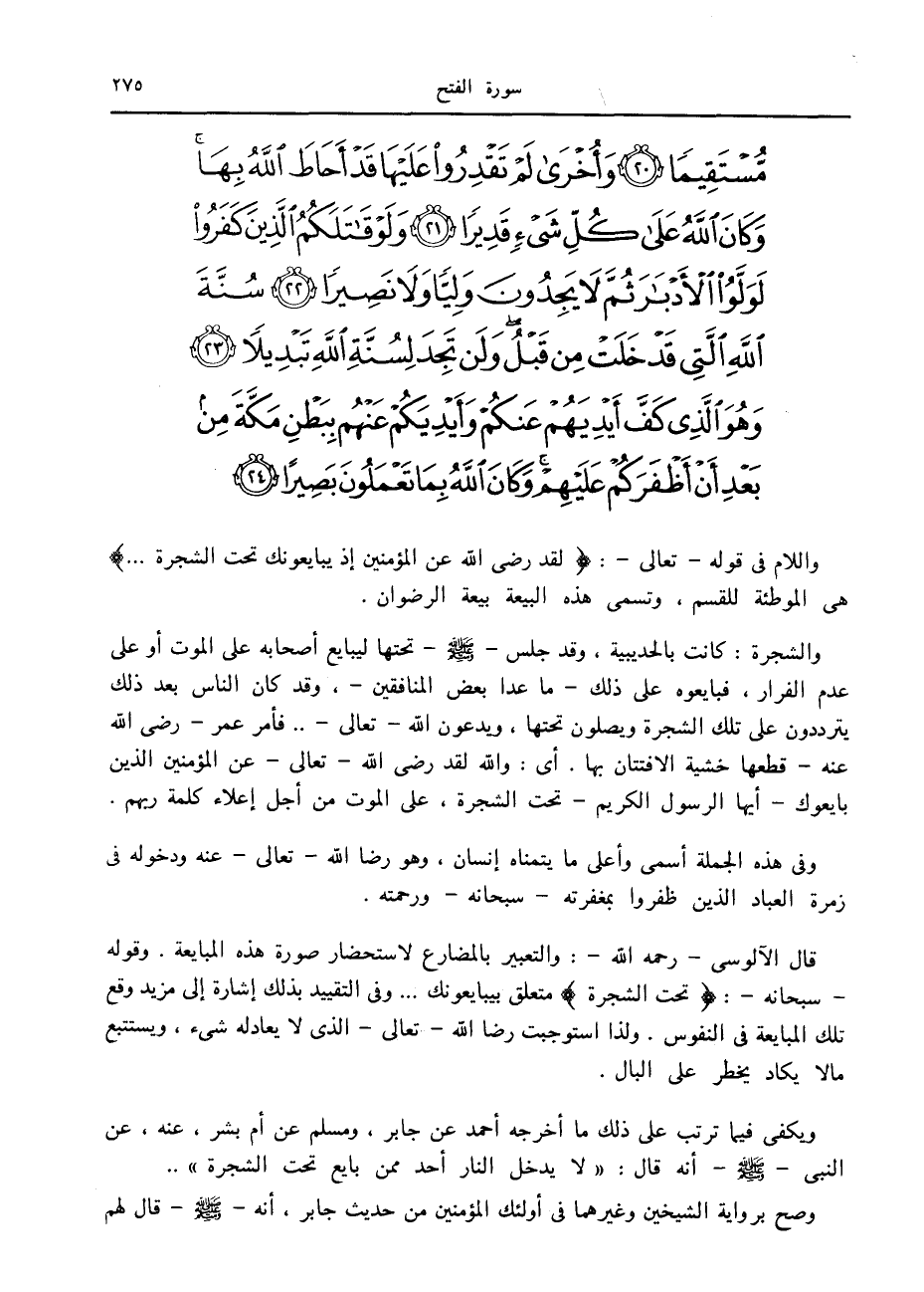 والشجرة: كانت بالحديبية، وقد جلس صلّى الله عليه وسلّم تحتها ليبايع أصحابه على الموت أو على عدم الفرار، فبايعوه على ذلك- ما عدا بعض المنافقين-، وقد كان الناس بعد ذلك يترددون على تلك الشجرة ويصلون تحتها، ويدعون الله- تعالى-.. فأمر عمر- رضى الله عنه- قطعها خشية الافتتان بها. أى: والله لقد رضى الله- تعالى- عن المؤمنين الذين بايعوك- أيها الرسول الكريم- تحت الشجرة، على الموت من أجل إعلاء كلمة ربهم.