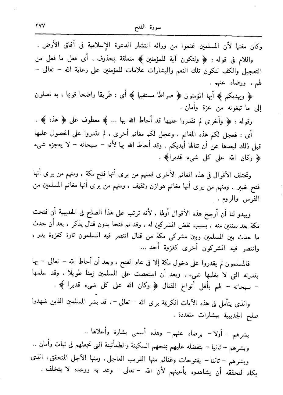 ويبدو لنا أن أرجح هذه الأقوال أولها، لأنه ترتب على هذا الصلح في الحديبية أن فتحت مكة بعد سنتين منه، بسبب نقض المشركين له، وقد تم فتحا بدون قتال يذكر، بعد أن حدث ما حدث بين المسلمين وبين مشركي مكة من قتال انتصر فيه المسلمون تارة كغزوة بدر، وانتصر فيه المشركون أخرى كغزوة أحد ...