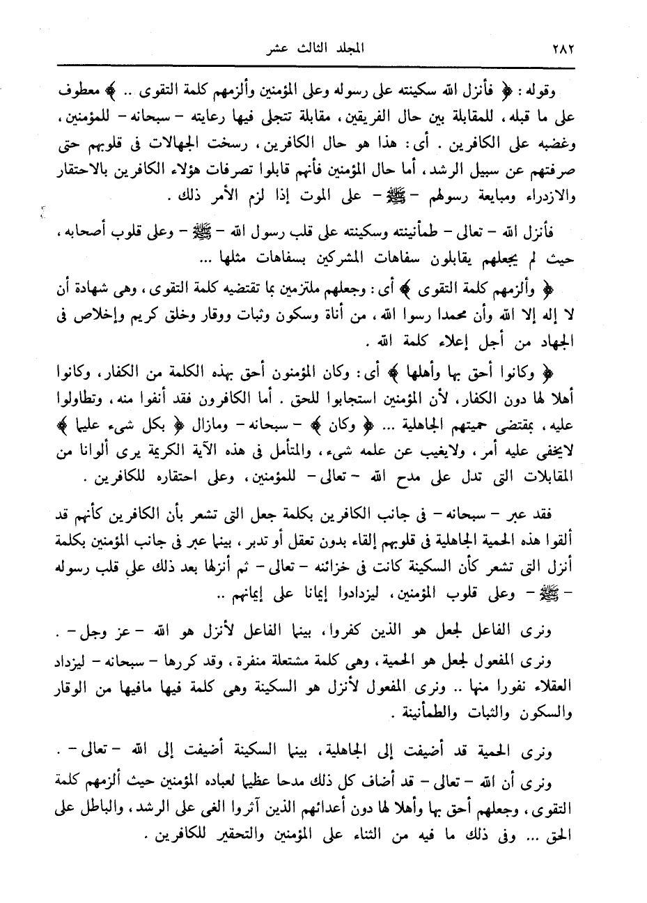وقوله: فَأَنْزَلَ اللَّهُ سَكِينَتَهُ عَلى رَسُولِهِ وَعَلَى الْمُؤْمِنِينَ وَأَلْزَمَهُمْ كَلِمَةَ التَّقْوى.. معطوف على ما قبله، للمقابلة بين حال الفريقين، مقابلة تتجلى فيها رعايته- سبحانه- للمؤمنين، وغضبه على الكافرين. أى: هذا هو حال الكافرين، رسخت الجهالات في قلوبهم حتى صرفتهم عن سبيل الرشد، أما حال المؤمنين فإنهم قابلوا تصرفات هؤلاء الكافرين بالاحتقار والازدراء ومبايعة رسولهم صلّى الله عليه وسلّم على الموت إذا لزم الأمر ذلك.
