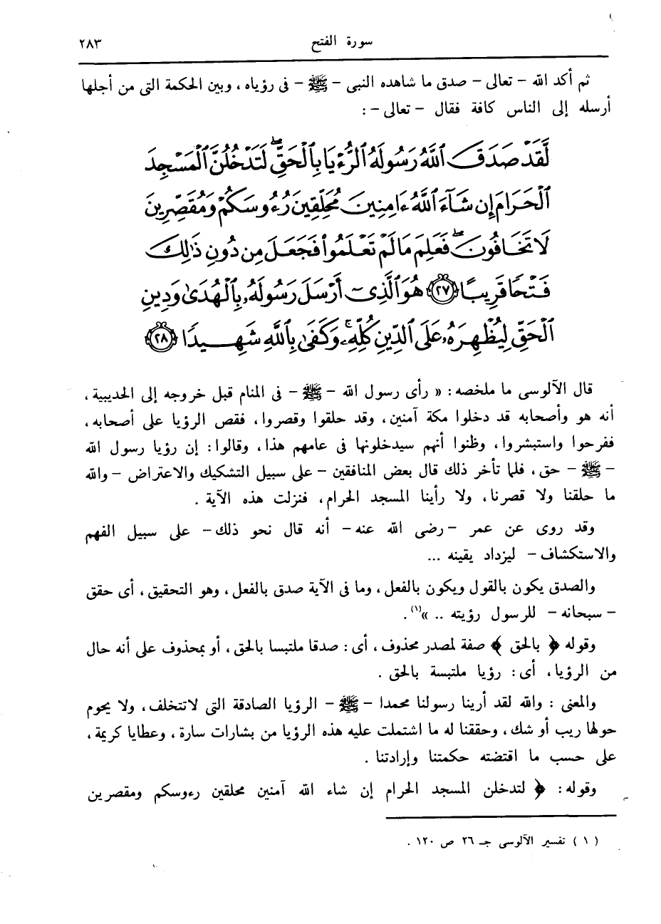 لَقَدْ صَدَقَ اللَّهُ رَسُولَهُ الرُّؤْيا بِالْحَقِّ لَتَدْخُلُنَّ الْمَسْجِدَ الْحَرامَ إِنْ شاءَ اللَّهُ آمِنِينَ مُحَلِّقِينَ رُؤُسَكُمْ وَمُقَصِّرِينَ لا تَخافُونَ فَعَلِمَ ما لَمْ تَعْلَمُوا فَجَعَلَ مِنْ دُونِ ذلِكَ فَتْحاً قَرِيباً (27) هُوَ الَّذِي أَرْسَلَ رَسُولَهُ بِالْهُدى وَدِينِ الْحَقِّ لِيُظْهِرَهُ عَلَى الدِّينِ كُلِّهِ وَكَفى بِاللَّهِ شَهِيداً (28)