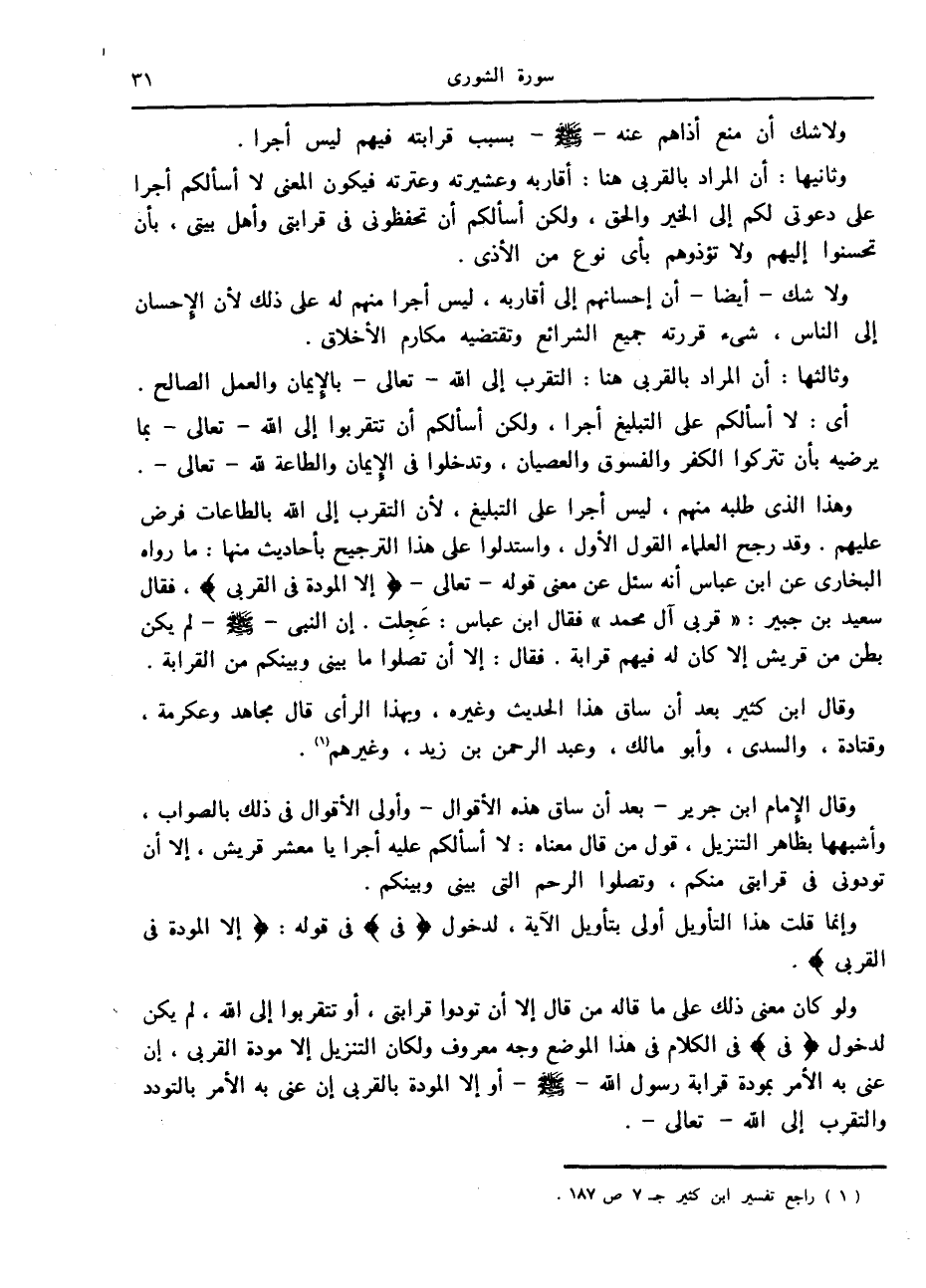 وثانيها: أن المراد بالقربى هنا: أقاربه وعشيرته وعترته فيكون المعنى لا أسألكم أجرا على دعوتي لكم إلى الخير والحق، ولكن أسألكم أن تحفظوني في قرابتي وأهل بيتي، بأن تحسنوا إليهم ولا تؤذوهم بأى نوع من الأذى.