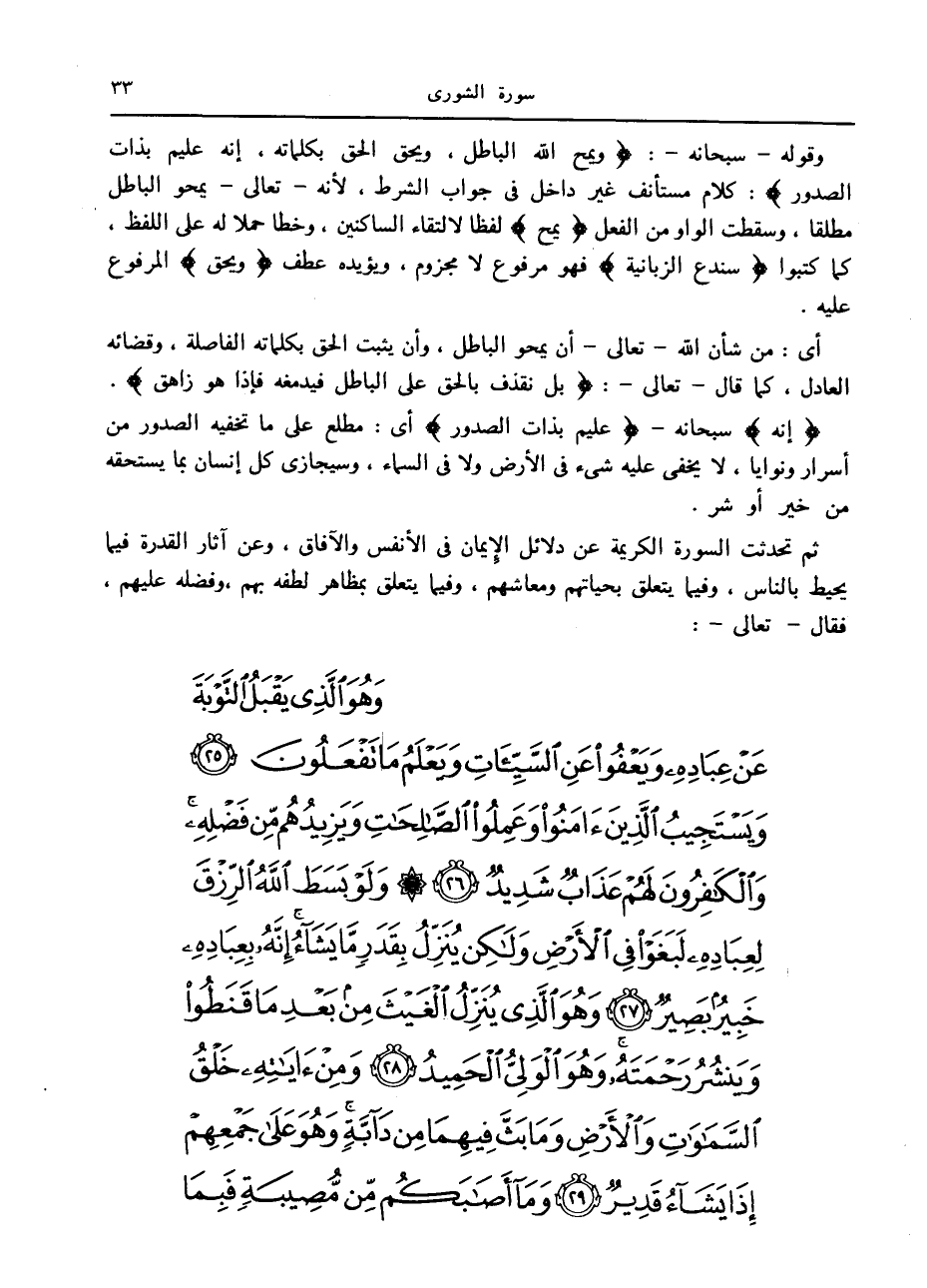 وقوله- سبحانه-: وَيَمْحُ اللَّهُ الْباطِلَ، وَيُحِقُّ الْحَقَّ بِكَلِماتِهِ، إِنَّهُ عَلِيمٌ بِذاتِ الصُّدُورِ: كلام مستأنف غير داخل في جواب الشرط، لأنه- تعالى- يمحو الباطل مطلقا، وسقطت الواو من الفعل يَمْحُ لفظا لالتقاء الساكنين، وخطا حملا له على اللفظ، كما كتبوا سَنَدْعُ الزَّبانِيَةَ فهو مرفوع لا مجزوم، ويؤيده عطف وَيُحِقُّ المرفوع عليه.