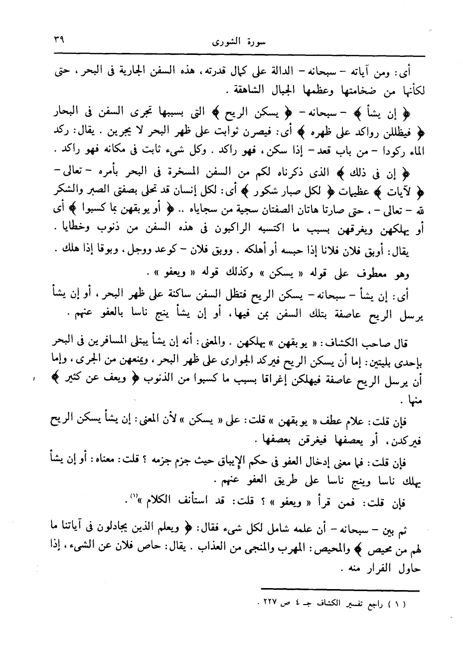 فإن قلت: علام عطف «يوبقهن» قلت: على «يسكن» لأن المعنى: إن يشأ يسكن الريح فيركدن، أو يعصفها فيغرقن بعصفها.