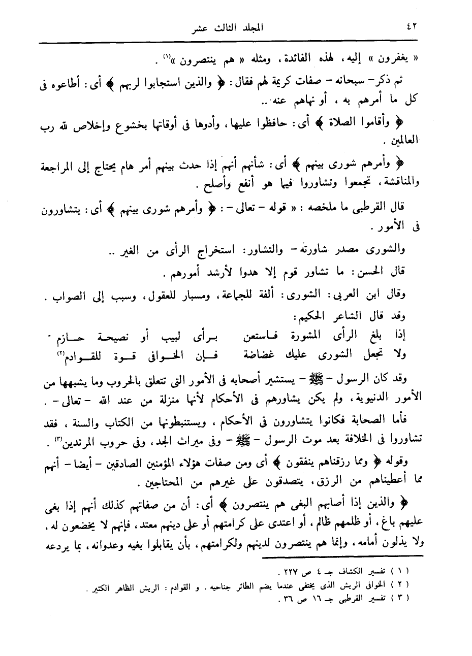 قال القرطبي ما ملخصه: «قوله- تعالى-: وَأَمْرُهُمْ شُورى بَيْنَهُمْ أى: يتشاورون في الأمور.