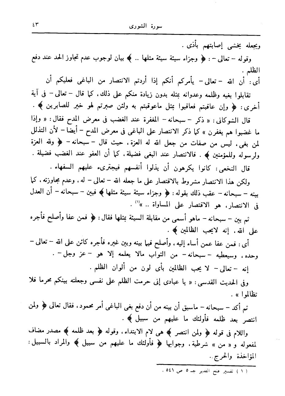 ثم أكد- سبحانه- ما سبق أن بينه من أن دفع بغى الباغي أمر محمود، فقال تعالى وَلَمَنِ انْتَصَرَ بَعْدَ ظُلْمِهِ فَأُولئِكَ ما عَلَيْهِمْ مِنْ سَبِيلٍ.