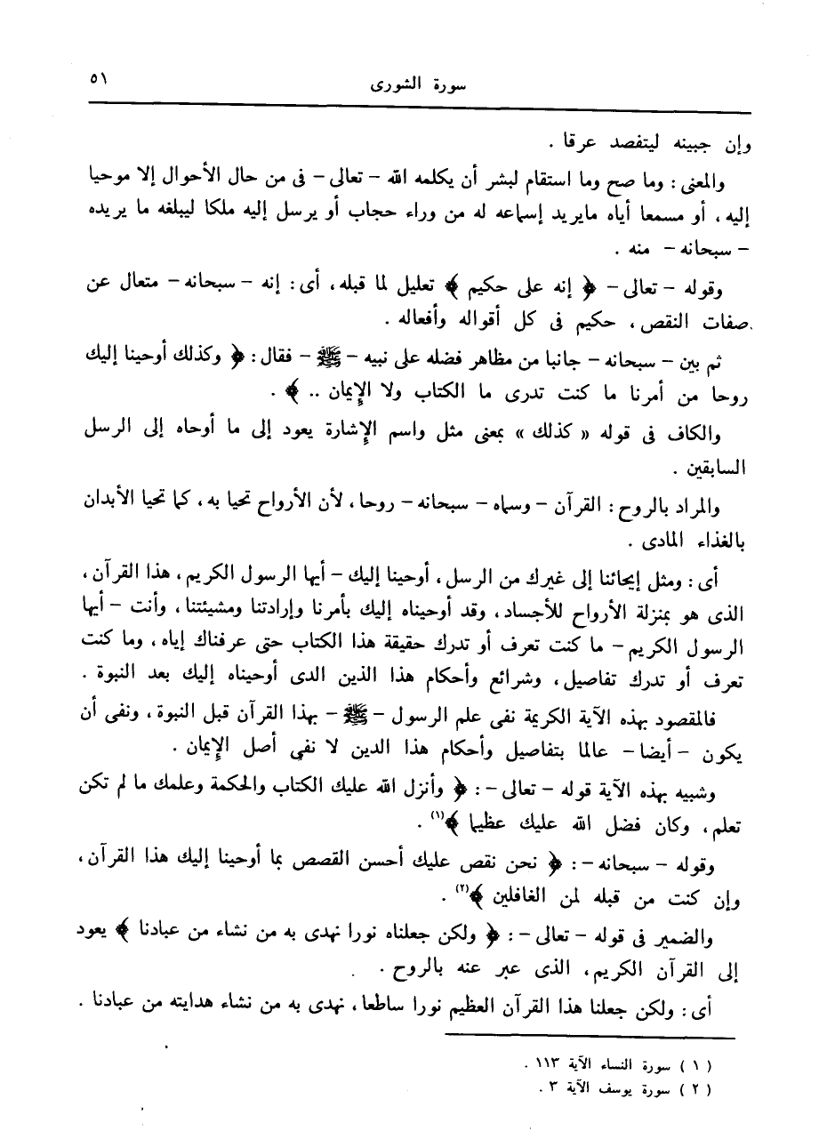 ثم بين- سبحانه- جانبا من مظاهر فضله على نبيه صلّى الله عليه وسلّم فقال: وَكَذلِكَ أَوْحَيْنا إِلَيْكَ رُوحاً مِنْ أَمْرِنا ما كُنْتَ تَدْرِي مَا الْكِتابُ وَلَا الْإِيمانُ ...