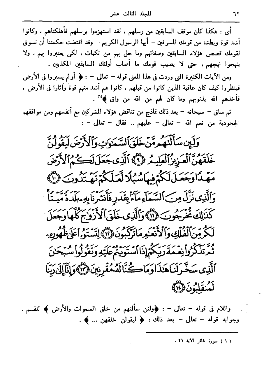 ومن الآيات الكثيرة التي وردت في هذا المعنى قوله- تعالى-: أَوَلَمْ يَسِيرُوا فِي الْأَرْضِ فَيَنْظُرُوا كَيْفَ كانَ عاقِبَةُ الَّذِينَ كانُوا مِنْ قَبْلِهِمْ، كانُوا هُمْ أَشَدَّ مِنْهُمْ قُوَّةً وَآثاراً فِي الْأَرْضِ، فَأَخَذَهُمُ اللَّهُ بِذُنُوبِهِمْ وَما كانَ لَهُمْ مِنَ اللَّهِ مِنْ واقٍ «1» .