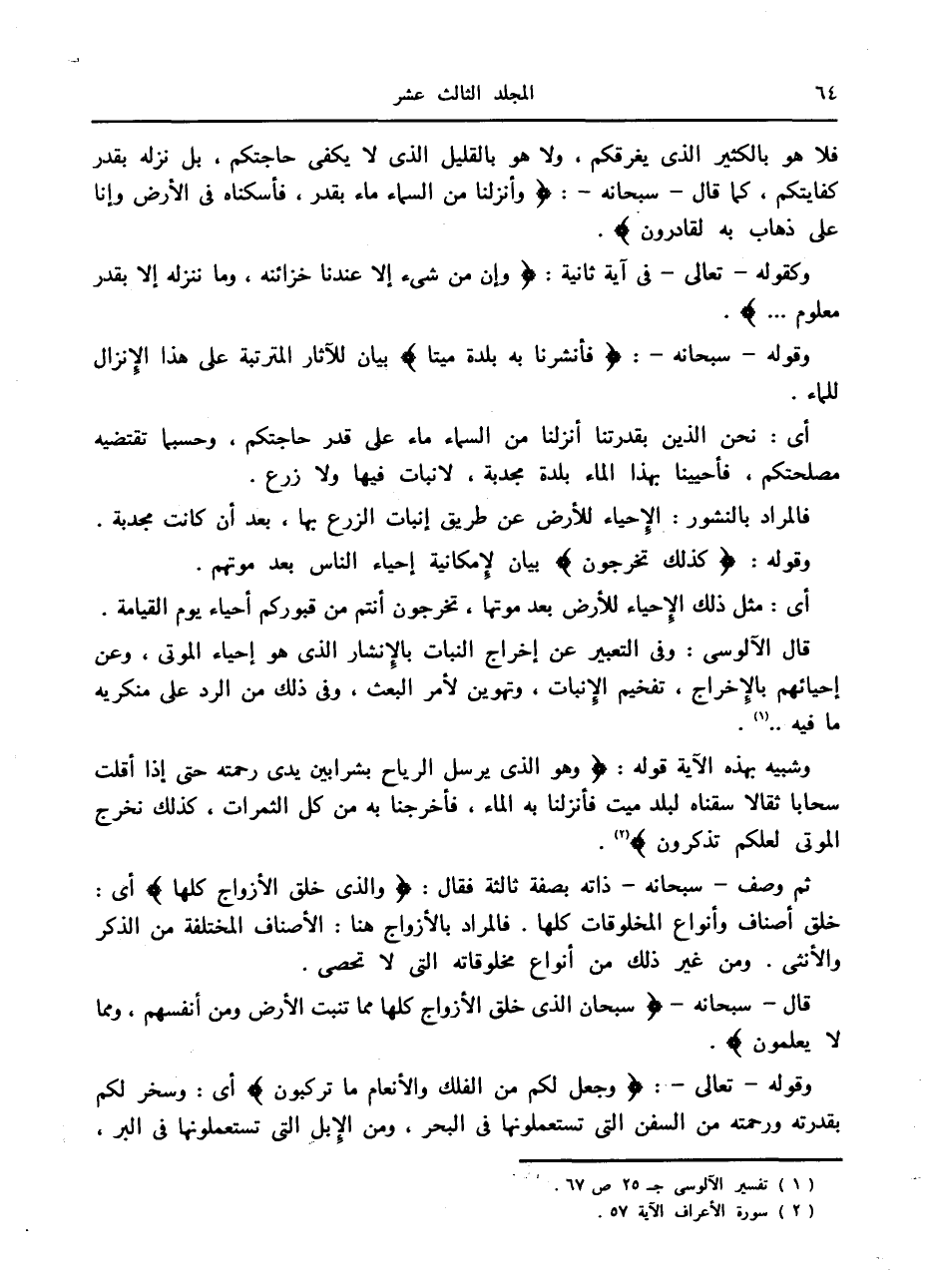 وكقوله- تعالى- في آية ثانية: وَإِنْ مِنْ شَيْءٍ إِلَّا عِنْدَنا خَزائِنُهُ، وَما نُنَزِّلُهُ إِلَّا بِقَدَرٍ مَعْلُومٍ....