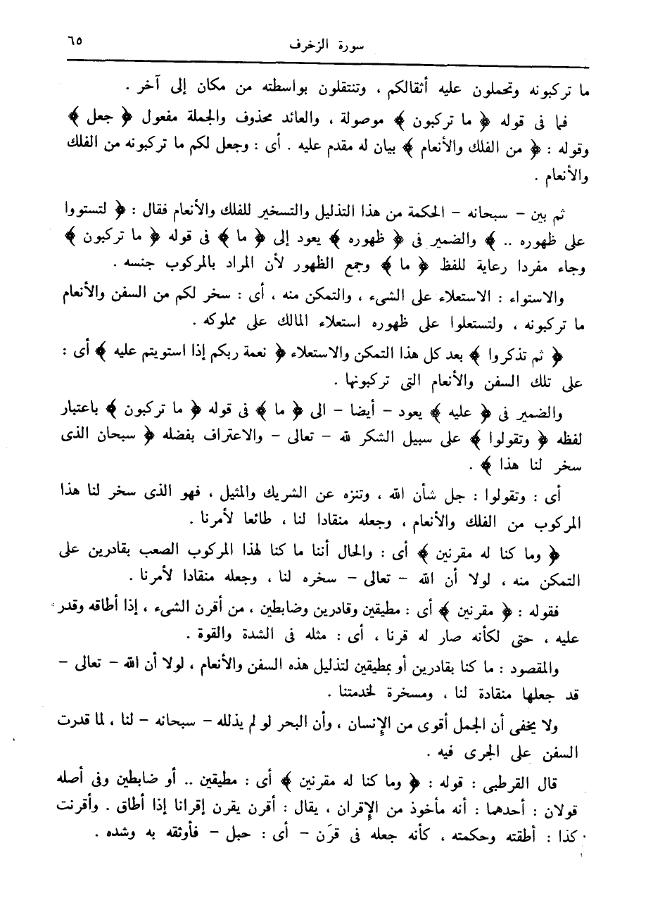 والضمير في عَلَيْهِ يعود- أيضا- الى ما في قوله ما تَرْكَبُونَ باعتبار لفظه وَتَقُولُوا على سبيل الشكر لله- تعالى- والاعتراف بفضله سُبْحانَ الَّذِي سَخَّرَ لَنا هذا.