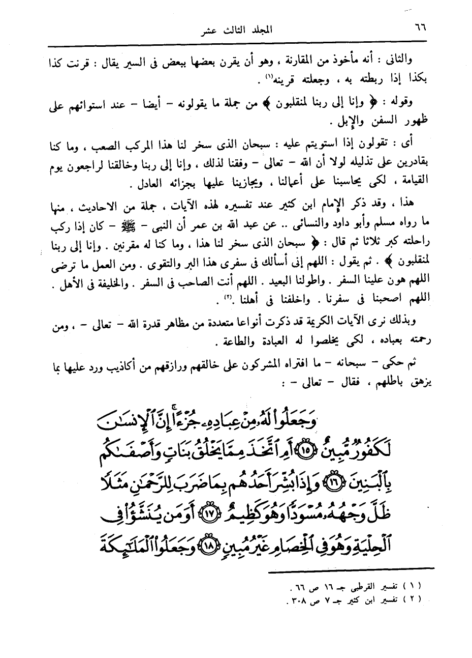 هذا، وقد ذكر الإمام ابن كثير عند تفسيره لهذه الآيات، جملة من الأحاديث، منها ما رواه مسلم وأبو داود والنسائي.. عن عبد الله بن عمر أن النبي صلّى الله عليه وسلّم كان إذا ركب راحلته كبر ثلاثا ثم قال: سُبْحانَ الَّذِي سَخَّرَ لَنا هذا، وَما كُنَّا لَهُ مُقْرِنِينَ. وَإِنَّا إِلى رَبِّنا لَمُنْقَلِبُونَ. ثم يقول: اللهم إنى أسألك في سفري هذا البر والتقوى. ومن العمل ما ترضى اللهم هون علينا السفر. واطولنا البعيد. اللهم أنت الصاحب في السفر. والخليفة في الأهل.