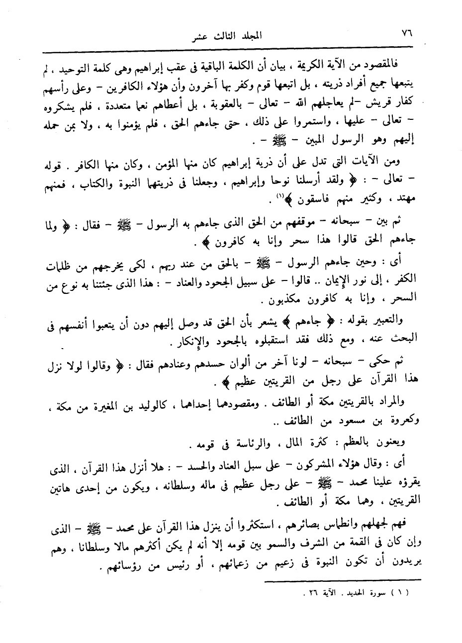 فالمقصود من الآية الكريمة، بيان أن الكلمة الباقية في عقب إبراهيم وهي كلمة التوحيد، لم يتبعها جميع أفراد ذريته، بل اتبعها قوم وكفر بها آخرون وأن هؤلاء الكافرين- وعلى رأسهم كفار قريش- لم يعاجلهم الله- تعالى- بالعقوبة، بل أعطاهم نعما متعددة، فلم يشكروه- تعالى- عليها، واستمروا على ذلك، حتى جاءهم الحق، فلم يؤمنوا به، ولا بمن حمله إليهم وهو الرسول المبين صلّى الله عليه وسلّم.