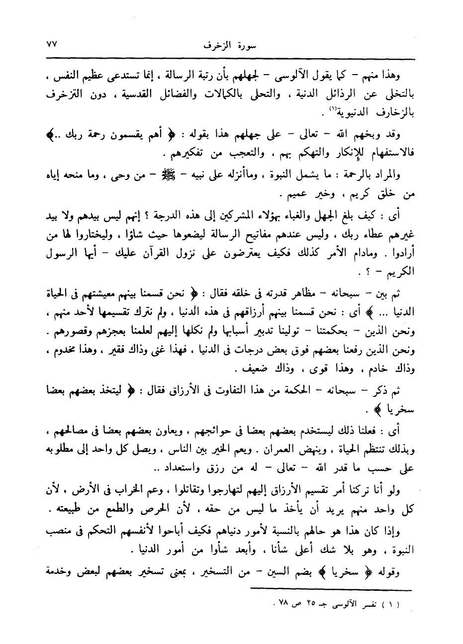 وهذا منهم- كما يقول الآلوسى- لجهلهم بأن رتبة الرسالة، إنما تستدعى عظيم النفس، بالتخلي عن الرذائل الدنية، والتحلي بالكمالات والفضائل القدسية، دون التزخرف بالزخارف الدنيوية «1» .