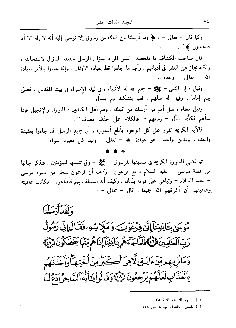 وكما قال- تعالى-: وَما أَرْسَلْنا مِنْ قَبْلِكَ مِنْ رَسُولٍ إِلَّا نُوحِي إِلَيْهِ أَنَّهُ لا إِلهَ إِلَّا أَنَا فَاعْبُدُونِ «1» .