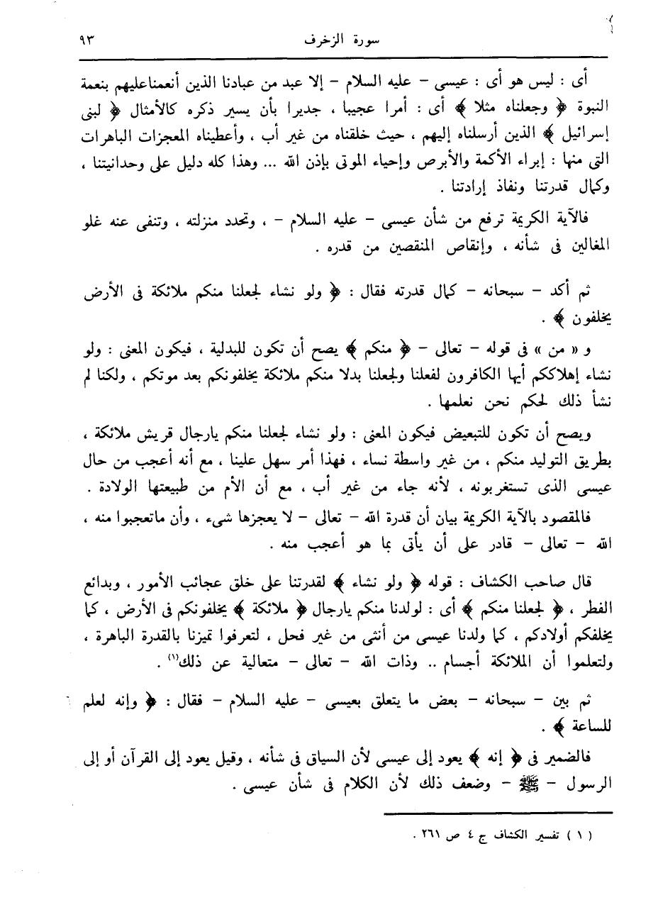 فالضمير في إِنَّهُ يعود إلى عيسى لأن السياق في شأنه، وقيل يعود إلى القرآن أو إلى الرسول صلّى الله عليه وسلّم وضعف ذلك لأن الكلام في شأن عيسى.