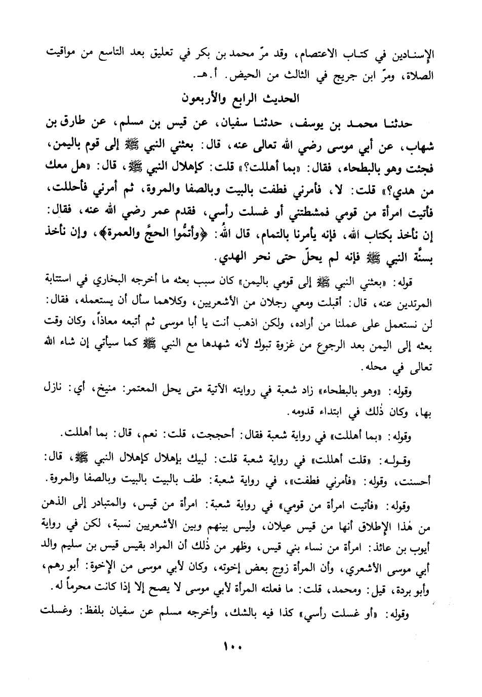 حَدَّثَنَا مُحَمَّدُ بْنُ يُوسُفَ، حَدَّثَنَا سُفْيَانُ، عَنْ قَيْسِ بْنِ مُسْلِمٍ، عَنْ طَارِقِ بْنِ شِهَابٍ، عَنْ أَبِي مُوسَى رضي الله عنه، قَالَ: بَعَثَنِي النَّبِيُّ -صلى الله عليه وسلم- إِلَى قَوْمٍ بِالْيَمَنِ، فَجِئْتُ وَهْوَ بِالْبَطْحَاءِ فَقَالَ: "بِمَا أَهْلَلْتَ؟ ". قُلْتُ: أَهْلَلْتُ كَإِهْلاَلِ النَّبِيِّ -صلى الله عليه وسلم- قَالَ: "هَلْ مَعَكَ مِنْ هَدْيٍ؟ ". قُلْتُ: لاَ. فَأَمَرَنِي فَطُفْتُ بِالْبَيْتِ وَبِالصَّفَا وَالْمَرْوَةِ ثُمَّ أَمَرَنِي فَأَحْلَلْتُ، فَأَتَيْتُ امْرَأَةً مِنْ قَوْمِي فَمَشَطَتْنِي، أَوْ غَسَلَتْ رَأْسِي، فَقَدِمَ عُمَرُ رضي الله عنه فَقَالَ: إِنْ نَأْخُذْ بِكِتَابِ اللَّهِ فَإِنَّهُ يَأْمُرُنَا بِالتَّمَامِ قَالَ اللَّهُ: {وَأَتِمُّوا الْحَجَّ وَالْعُمْرَةَ} وَإِنْ نَأْخُذْ بِسُنَّةِ النَّبِيِّ -صلى الله عليه وسلم- فَإِنَّهُ لَمْ يَحِلَّ حَتَّى نَحَرَ الْهَدْيَ.