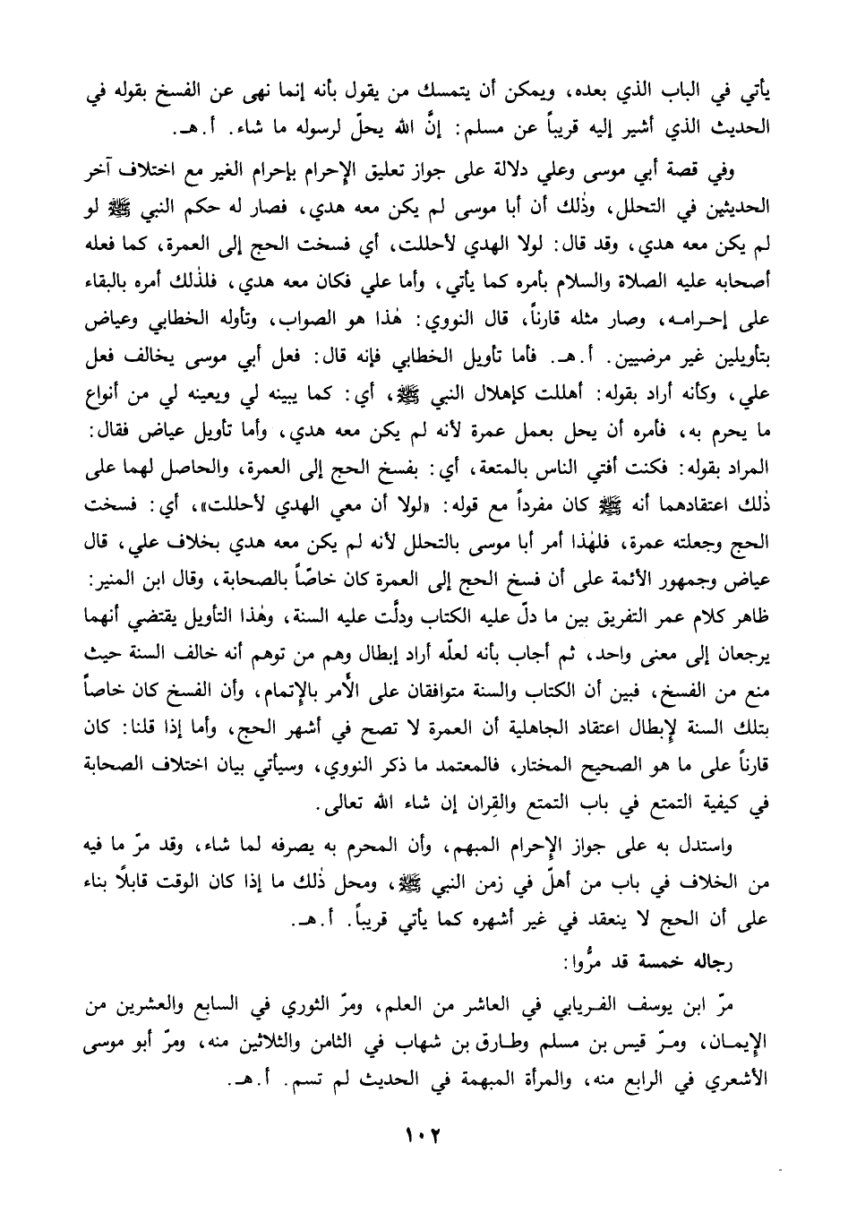 يأتي في الباب الذي بعده، ويمكن أن يتمسك من يقول بأنه إنما نهى عن الفسخ بقوله في الحديث الذي أشير إليه قريبًا عن مسلم: إنَّ الله يحلّ لرسوله ما شاء. أ. هـ.