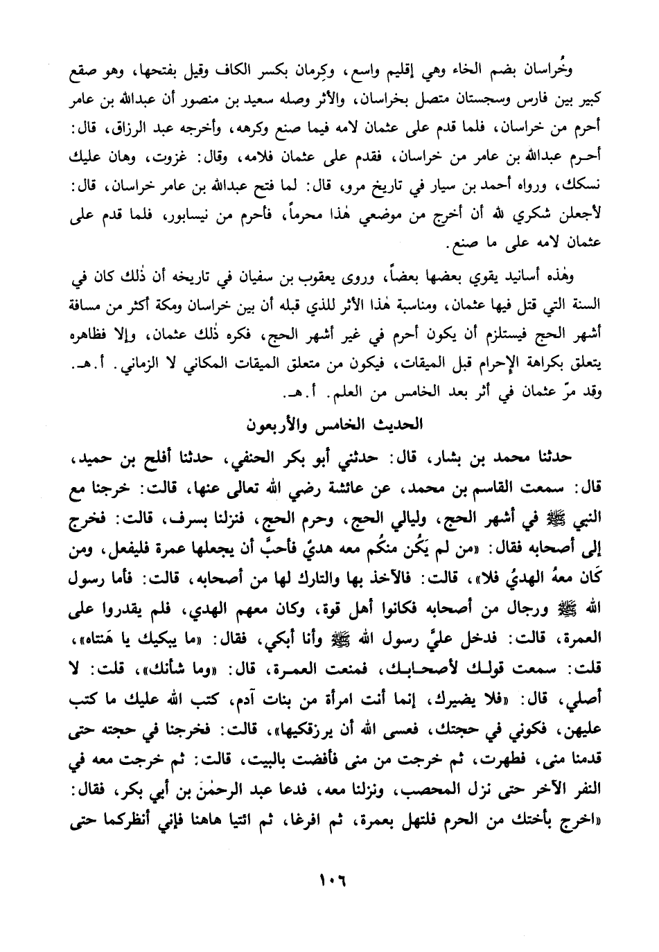 وهذه أسانيد يقوي بعضها بعضًا، وروى يعقوب بن سفيان في تاريخه أن ذلك كان في السنة التي قتل فيها عثمان، ومناسبة هذا الأثر للذي قبله أن بين خراسان ومكة أكثر من مسافة أشهر الحج فيستلزم أن يكون أحرم في غير أشهر الحج، فكره ذلك عثمان، وإِلا فظاهره يتعلق بكراهة الإِحرام قبل الميقات، فيكون من متعلق الميقات المكاني لا الزماني. أ. هـ. وقد مرّ عثمان في أثر بعد الخامس من العلم. أ. هـ.