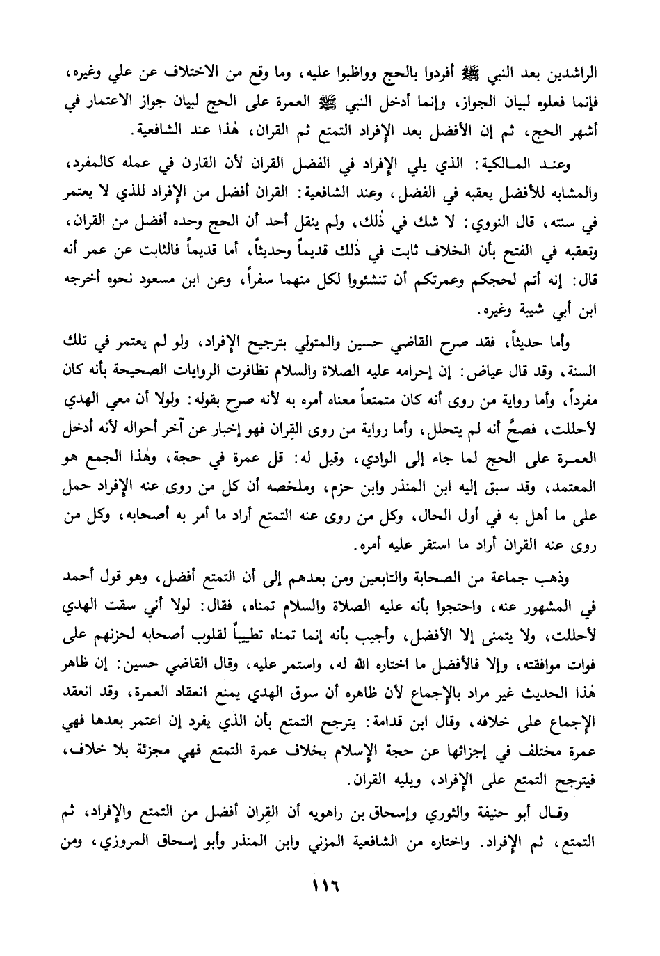 وأما حديثًا، فقد صرح القاضي حسين والمتولي بترجيح الإِفراد، ولو لم يعتمر في تلك السنة، وقد قال عياض: إن إحرامه عليه الصلاة والسلام تظافرت الروايات الصحيحة بأنه كان مفردًا، وأما رواية من روى أنه كان متمتعًا معناه أمره به لأنه صرح بقوله: ولولا أن معي الهدي لأحللت، فصحَّ أنه لم يتحلل، وأما رواية من روى القِران فهو إخبار عن آخر أحواله لأنه أدخل العمرة على الحج لما جاء إلى الوادي، وقيل له: قل عمرة في حجة، وهذا الجمع هو المعتمد، وقد سبق إليه ابن المنذر وابن حزم، وملخصه أن كل من روى عنه الإِفراد حمل على ما أهل به في أول الحال، وكل من روى عنه التمتع أراد ما أمر به أصحابه، وكل من روى عنه القرآن أراد ما استقر عليه أمره.