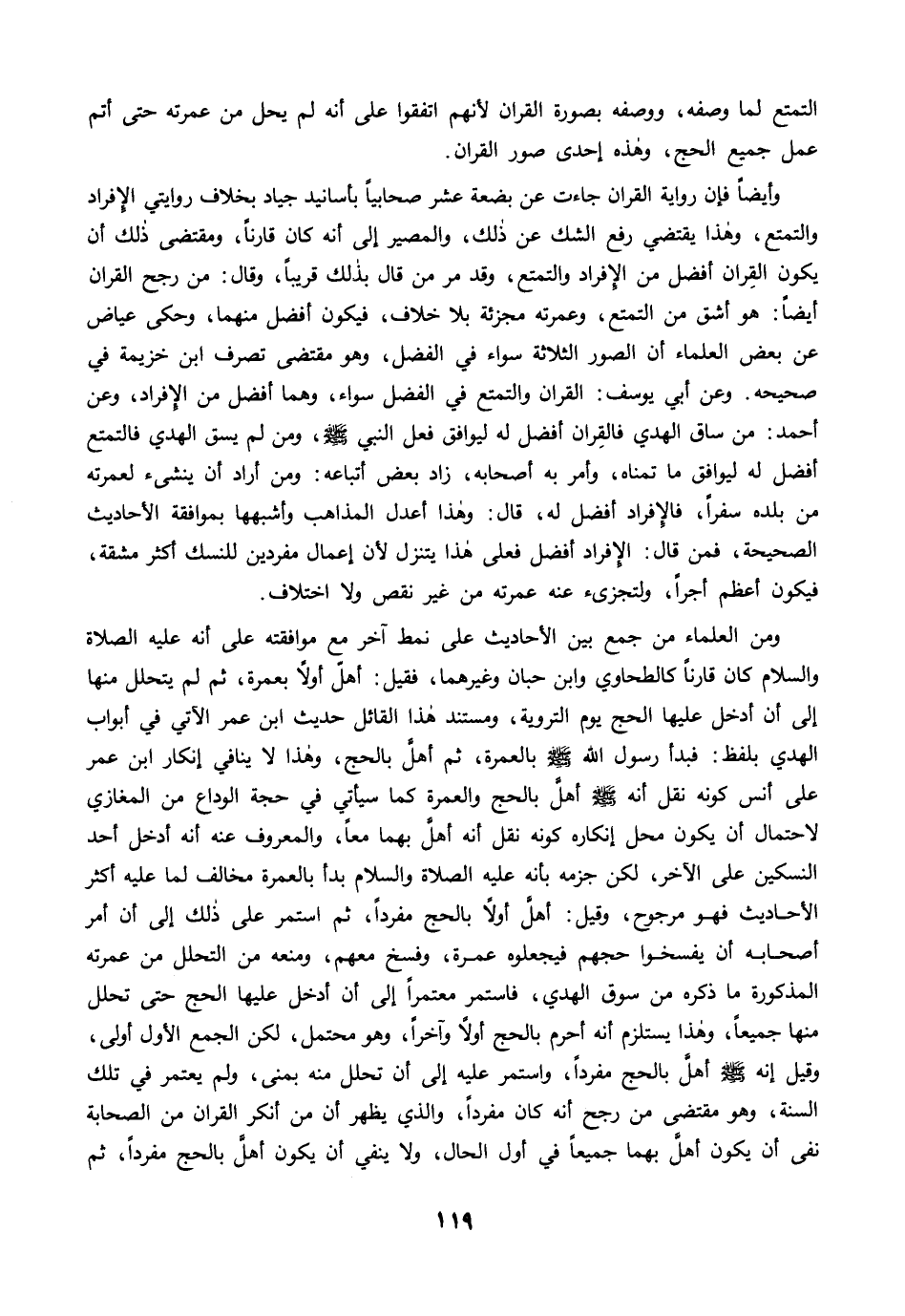 ومن العلماء من جمع بين الأحاديث على نمط آخر مع موافقته على أنه عليه الصلاة والسلام كان قارنًا كالطحاوي وابن حبان وغيرهما، فقيل: أهلّ أولًا بعمرة، ثم لم يتحلل منها إلى أن أدخل عليها الحج يوم التروية، ومستند هذا القائل حديث ابن عمر الآتي في أبواب الهدي بلفظ: فبدأ رسول الله -صلى الله عليه وسلم- بالعمرة، ثم أهلَّ بالحج، وهذا لا ينافي إنكار ابن عمر على أنس كونه نقل أنه -صلى الله عليه وسلم- أهلَّ بالحج والعمرة كما سيأتي في حجة الوداع من المغازي لاحتمال أن يكون محل إنكاره كونه نقل أنه أهلَّ بهما معًا، والمعروف عنه أنه أدخل أحد النسكين على الآخر، لكن جزمه بأنه عليه الصلاة والسلام بدأ بالعمرة مخالف لما عليه أكثر الأحاديث فهو مرجوح، وقيل: أهل أولًا بالحج مفردًا، ثم استمر على ذلك إلى أن أمر أصحابه أن يفسخوا حجهم فيجعلوه عمرة، وفسخ معهم، ومنعه من التحلل من عمرته المذكورة ما ذكره من سوق الهدي، فاستمر معتمرًا إلي أن أدخل عليها الحج حتى تحلل منها جميعًا، وهذا يستلزم أنه أحرم بالحج أولًا وآخرًا، وهو محتمل، لكن الجمع الأول أولى، وقيل إنه-صلى الله عليه وسلم- أهلَّ بالحج مفردًا، واستمر عليه إلى أن تحلل منه بمنى، ولم يعتمر في تلك السنة، وهو مقتضى من رجح أنه كان مفردًا، والذي يظهر أن من أنكر القران من الصحابة نفى أن يكون أهلَّ بهما جميعًا في أول الحال، ولا ينفي أن يكون أهلَّ بالحج مفردًا، ثم