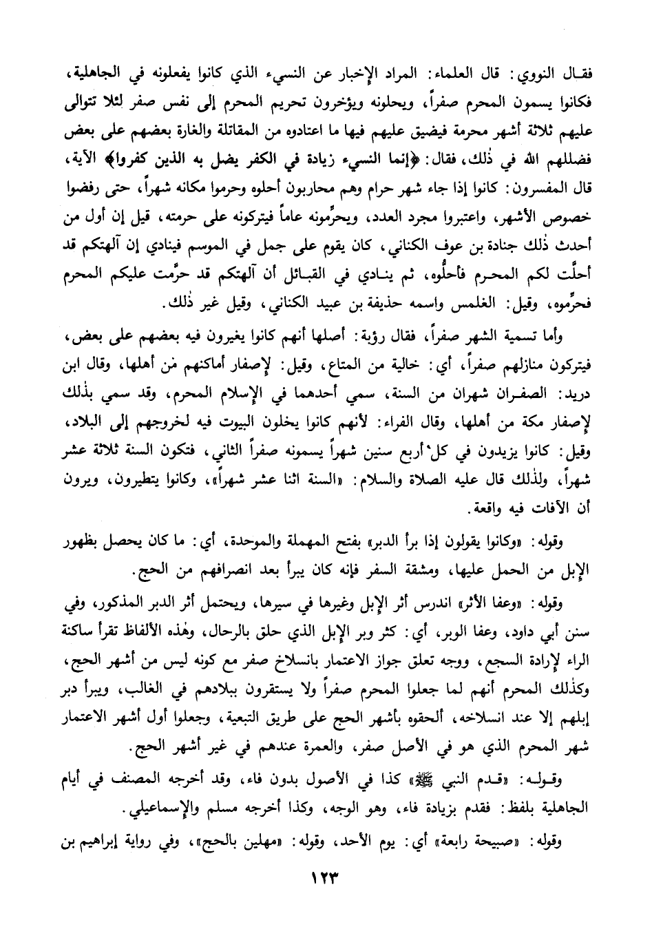 فقال النووي: قال العلماء: المراد الإخبار عن النسيء الذي كانوا يفعلونه في الجاهلية، فكانوا يسمون المحرم صفرًا، ويحلونه ويؤخرون تحريم المحرم إلى نفس صفر لئلا تتوالى عليهم ثلاثة أشهر محرمة فيضيق عليهم فيها ما اعتادوه من المقاتلة والغارة بعضهم على بعض فضللهم الله في ذلك، فقال: {إِنَّمَا النَّسِيءُ زِيَادَةٌ فِي الْكُفْرِ يُضَلُّ بِهِ الَّذِينَ كَفَرُوا} الآية، قال المفسرون: كانوا إذا جاء شهر حرام وهم محاربون أحلوه وحرموا مكانه شهرًا، حتى رفضوا خصوص الأشهر، واعتبروا مجرد العدد، ويحرِّمونه عامًا فيتركونه على حرمته، قيل إن أول من أحدث ذلك جنادة بن عوف الكناني، كان يقوم على جمل في الموسم فينادي إن آلهتكم قد أحلَّت لكم المحرم فأحلُّوه، ثم ينادي في القبائل أن آلهتكم قد حرَّمت عليكم المحرم فحرِّموه، وقيل: الغلمس واسمه حذيفة بن عبيد الكناني، وقيل غير ذلك.
