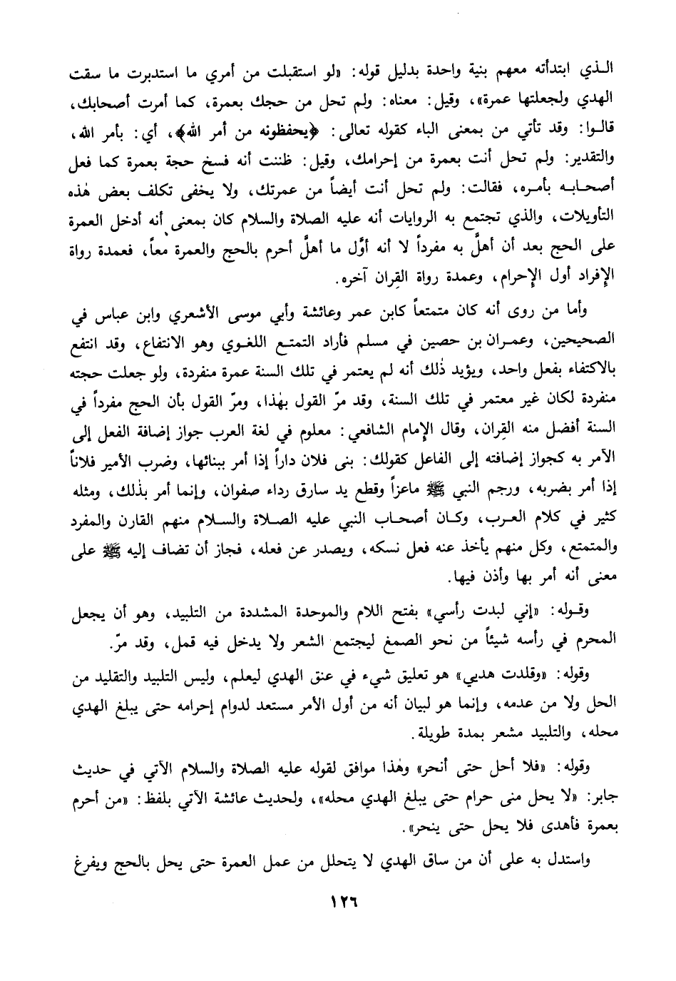 وأما من روى أنه كان متمتعًا كابن عمر وعائشة وأبي موسى الأشعري وابن عباس في الصحيحين، وعمران بن حصين في مسلم فأراد التمتع اللغوي وهو الانتفاع، وقد انتفع بالاكتفاء بفعل واحد، ويؤيد ذلك أنه لم يعتمر في تلك السنة عمرة منفردة، ولو جعلت حجته منفردة لكان غير معتمر في تلك السنة، وقد مرَّ القول بهذا، ومرَّ القول بأن الحج مفردًا في السنة أفضل منه القِران، وقال الإِمام الشافعي: معلوم في لغة العرب جواز إضافة الفعل إلى الآمر به كجواز إضافته إلى الفاعل كقولك: بني فلان دارًا إذا أمر ببنائها، وضرب الأمير فلانًا إذا أمر بضربه، ورجم النبي -صلى الله عليه وسلم- ماعزًا وقطع يد سارق رداء صفوان، وإنما أمر بذلك، ومثله كثير في كلام العرب، وكان أصحاب النبي عليه الصلاة والسلام منهم القارن والمفرد والمتمتع، وكل منهم يأخذ عنه فعل نسكه، ويصدر عن فعله، فجاز أن تضاف إليه -صلى الله عليه وسلم- على معنى أنه أمر بها وأذن فيها.