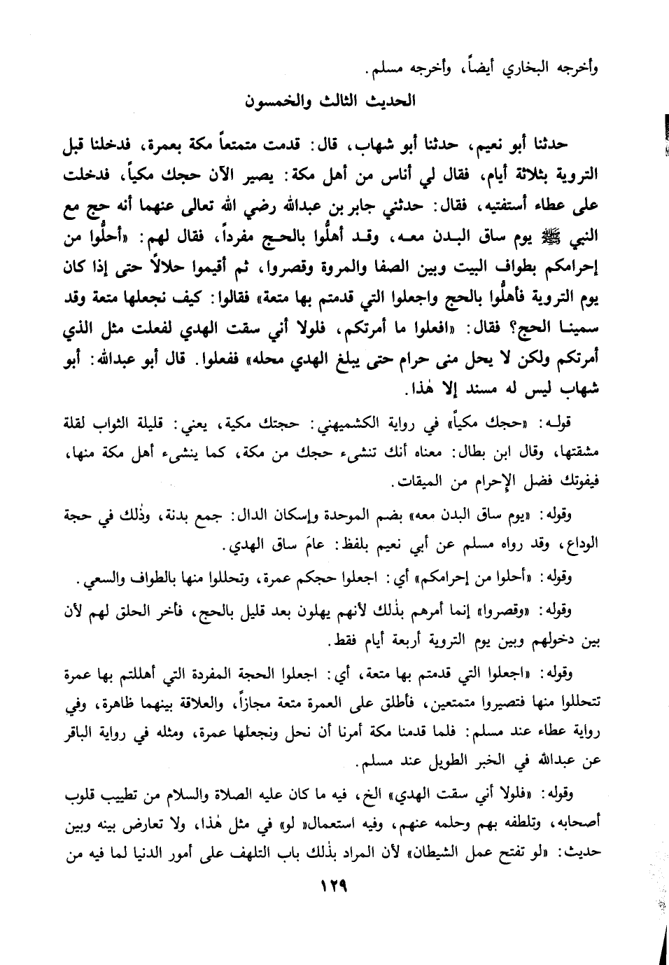حَدَّثَنَا أَبُو نُعَيْمٍ، حَدَّثَنَا أَبُو شِهَابٍ، قَالَ: قَدِمْتُ مُتَمَتِّعًا مَكَّةَ بِعُمْرَةٍ، فَدَخَلْنَا قَبْلَ التَّرْوِيَةِ بِثَلاَثَةِ أَيَّامٍ، فَقَالَ لِي أُنَاسٌ مِنْ أَهْلِ مَكَّةَ: تَصِيرُ الآنَ حَجَّتُكَ مَكِّيَّةً. فَدَخَلْتُ عَلَى عَطَاءٍ أَسْتَفْتِيهِ فَقَالَ: حَدَّثَنِي جَابِرُ بْنُ عَبْدِ اللَّهِ رضي الله عنهما أَنَّهُ حَجَّ مَعَ النَّبِيِّ -صلى الله عليه وسلم- يَوْمَ سَاقَ الْبُدْنَ مَعَهُ، وَقَدْ أَهَلُّوا بِالْحَجِّ مُفْرَدًا، فَقَالَ لَهُمْ: "أَحِلُّوا مِنْ إِحْرَامِكُمْ بِطَوَافِ الْبَيْتِ وَبَيْنَ الصَّفَا وَالْمَرْوَةِ، وَقَصِّرُوا ثُمَّ أَقِيمُوا حَلاَلاً، حَتَّى إِذَا كَانَ يَوْمُ التَّرْوِيَةِ فَأَهِلُّوا بِالْحَجِّ، وَاجْعَلُوا الَّتِي قَدِمْتُمْ بِهَا مُتْعَةً". فَقَالُوا: كَيْفَ نَجْعَلُهَا مُتْعَةً وَقَدْ سَمَّيْنَا الْحَجَّ؟ فَقَالَ: "افْعَلُوا مَا أَمَرْتُكُمْ، فَلَوْلاَ أَنِّي سُقْتُ الْهَدْيَ لَفَعَلْتُ مِثْلَ الَّذِي أَمَرْتُكُمْ، وَلَكِنْ لاَ يَحِلُّ مِنِّي حَرَامٌ حَتَّى يَبْلُغَ الْهَدْيُ مَحِلَّهُ". فَفَعَلُوا. قال أبو عبد الله: أبو شهاب ليس له مسند إلا هذا.