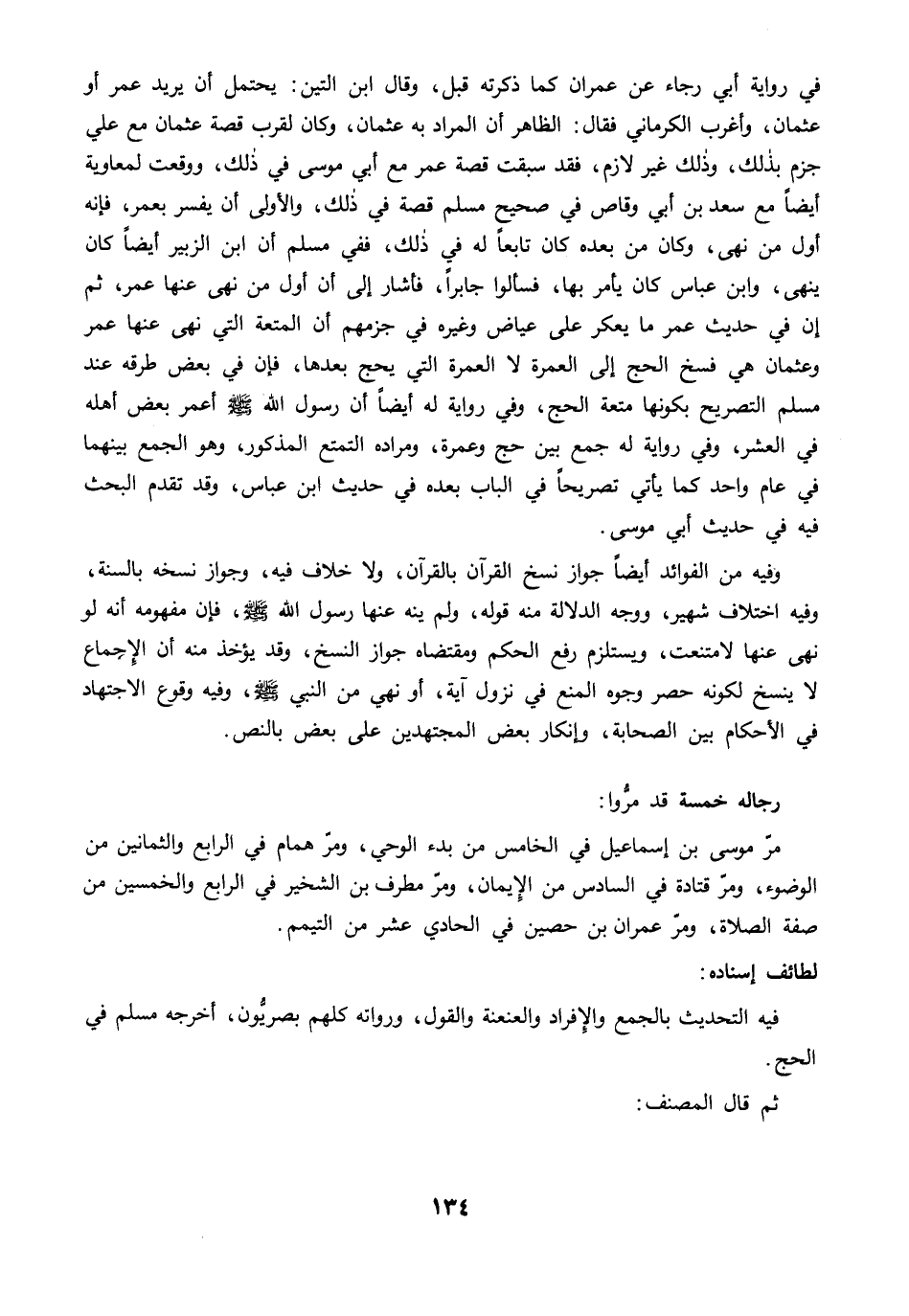 في رواية أبي رجاء عن عمران كما ذكرته قبل، وقال ابن التين: يحتمل أن يريد عمر أو عثمان، وأغرب الكرماني فقال: الظاهر أن المراد به عثمان، وكان لقرب قصة عثمان مع علي جزم بذلك، وذلك غير لازم، فقد سبقت قصة عمر مع أبي موسى في ذلك، ووقعت لمعاوية أيضًا مع سعد بن أبي وقاص في صحيح مسلم قصة في ذلك، والأولى أن يفسر بعمر، فإنه أول من نهى، وكان من بعده كان تابعاً له في ذلك، ففي مسلم أن ابن الزبير أيضًا كان ينهى، وابن عباس كان يأمر بها، فسألوا جابرًا، فأشار إلى أن أول من نهى عنها عمر، ثم إن في حديث عمر ما يعكر على عياض وغيره في جزمهم أن المتعة التي نهى عنها عمر وعثمان هي فسخ الحج إلى العمرة لا العمرة التي يحج بعدها، فإن في بعض طرقه عند مسلم التصريح بكونها متعة الحج، وفي رواية له أيضًا أن رسول الله -صلى الله عليه وسلم- أعمر بعض أهله في العشر، وفي رواية له جمع بين حج وعمرة، ومراده التمتع المذكور، وهو الجمع بينهما في عام واحد كما يأتي تصريحًا في الباب بعده في حديث ابن عباس، وقد تقدم البحث فيه في حديث أبي موسى.