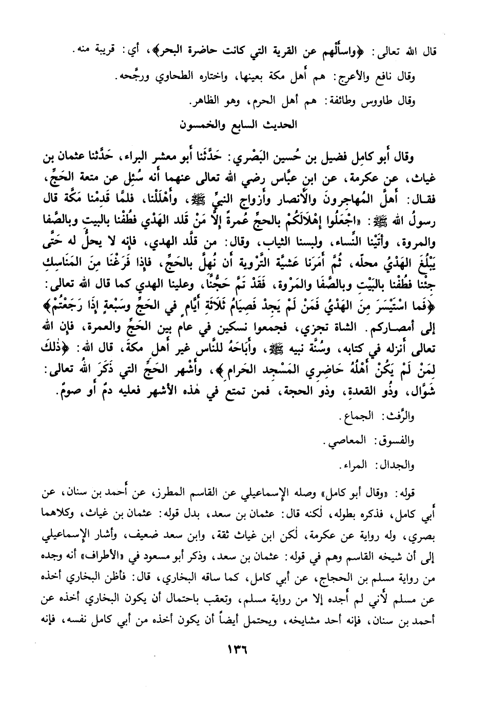 وَقَالَ أَبُو كَامِلٍ فُضَيْلُ بْنُ حُسَيْنٍ الْبَصْرِيُّ: حَدَّثَنَا أَبُو مَعْشَرٍ البراء، حَدَّثَنَا عُثْمَانُ بْنُ غِيَاثٍ، عَنْ عِكْرِمَةَ، عَنِ ابْنِ عَبَّاسٍ رضي الله عنهما أَنَّهُ سُئِلَ عَنْ مُتْعَةِ الْحَجِّ، فَقَالَ: أَهَلَّ الْمُهَاجِرُونَ وَالأَنْصَارُ وَأَزْوَاجُ النَّبِيِّ -صلى الله عليه وسلم- فِي حَجَّةِ الْوَدَاعِ وَأَهْلَلْنَا، فَلَمَّا قَدِمْنَا مَكَّةَ قَالَ رَسُولُ اللَّهِ -صلى الله عليه وسلم-: "اجْعَلُوا إِهْلاَلَكُمْ بِالْحَجِّ عُمْرَةً إِلاَّ مَنْ قَلَّدَ الْهَدْيَ. فَطُفْنَا بِالْبَيْتِ وَبِالصَّفَا وَالْمَرْوَةِ وَأَتَيْنَا النِّسَاءَ، وَلَبِسْنَا الثِّيَابَ وَقَالَ: مَنْ قَلَّدَ الْهَدْيَ فَإِنَّهُ لاَ يَحِلُّ لَهُ حَتَّى يَبْلُغَ الْهَدْيُ مَحِلَّهُ. ثُمَّ أَمَرَنَا عَشِيَّةَ التَّرْوِيَةِ أَنْ نُهِلَّ بِالْحَجِّ، فَإِذَا فَرَغْنَا مِنَ الْمَنَاسِكِ جِئْنَا فَطُفْنَا بِالْبَيْتِ وَبِالصَّفَا وَالْمَرْوَةِ فَقَدْ تَمَّ حَجُّنَا، وَعَلَيْنَا الْهَدْيُ كَمَا قَالَ اللَّهُ تَعَالَى: {فَمَا اسْتَيْسَرَ مِنَ الْهَدْيِ فَمَنْ لَمْ يَجِدْ فَصِيَامُ ثَلَاثَةِ أَيَّامٍ فِي الْحَجِّ وَسَبْعَةٍ إِذَا رَجَعْتُمْ} إِلَى أَمْصَارِكُمْ. الشَّاةُ تَجْزِي، فَجَمَعُوا نُسُكَيْنِ فِي عَامٍ بَيْنَ الْحَجِّ وَالْعُمْرَةِ، فَإِنَّ اللَّهَ تَعَالَى أَنْزَلَهُ فِي كِتَابِهِ وَسَنَّهُ نَبِيُّهُ -صلى الله عليه وسلم-، وَأَبَاحَهُ لِلنَّاسِ غَيْرَ أَهْلِ مَكَّةَ، قَالَ اللَّهُ {ذَلِكَ لِمَنْ لَمْ يَكُنْ أَهْلُهُ حَاضِرِي الْمَسْجِدِ الْحَرَامِ} وَأَشْهُرُ الْحَجِّ الَّتِي ذَكَرَ اللَّهُ تَعَالَى: شَوَّالٌ وَذُو الْقَعْدَةِ وَذُو الْحَجَّةِ، فَمَنْ تَمَتَّعَ فِي هَذِهِ الأَشْهُرِ فَعَلَيْهِ دَمٌ أَوْ صَوْمٌ.