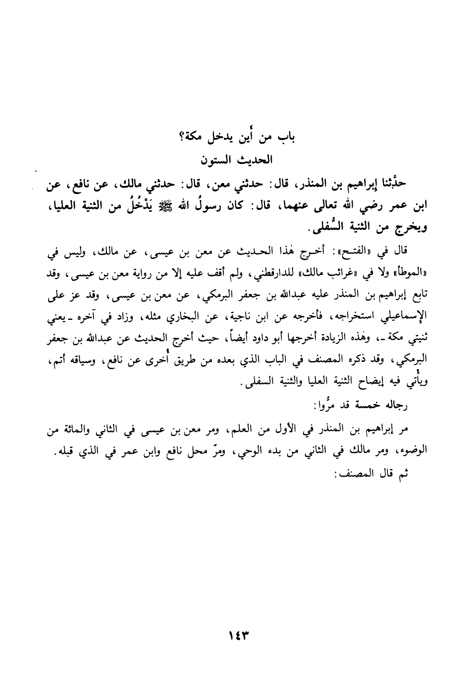 قال في "الفتح": أخرج هذا الحديث عن معن بن عيسى، عن مالك، وليس في "الموطأ" ولا في "غرائب مالك" للدارقطني، ولم أقف عليه إلا من رواية معن بت عيسى، وقد تابع إبراهيم بن المنذر عليه عبد الله بن جعفر البرمكي، عن معن بن عيسى، وقد عز على الإسماعيلي استخراجه، فأخرجه عن ابن ناجية، عن البخاري مثله، وزاد في آخره -يعني ثنيتي مكة-، وهذه الزيادة أخرجها أبو داود أيضًا، حيث أخرج الحديث عن عبد الله بن جعفر البرمكي، وقد ذكره المصنف في الباب الذي بعده من طريق أخرى عن نافع، وسياقه أتم، ويأْتي فيه إيضاح الثنية العليا والثنية السفلى.